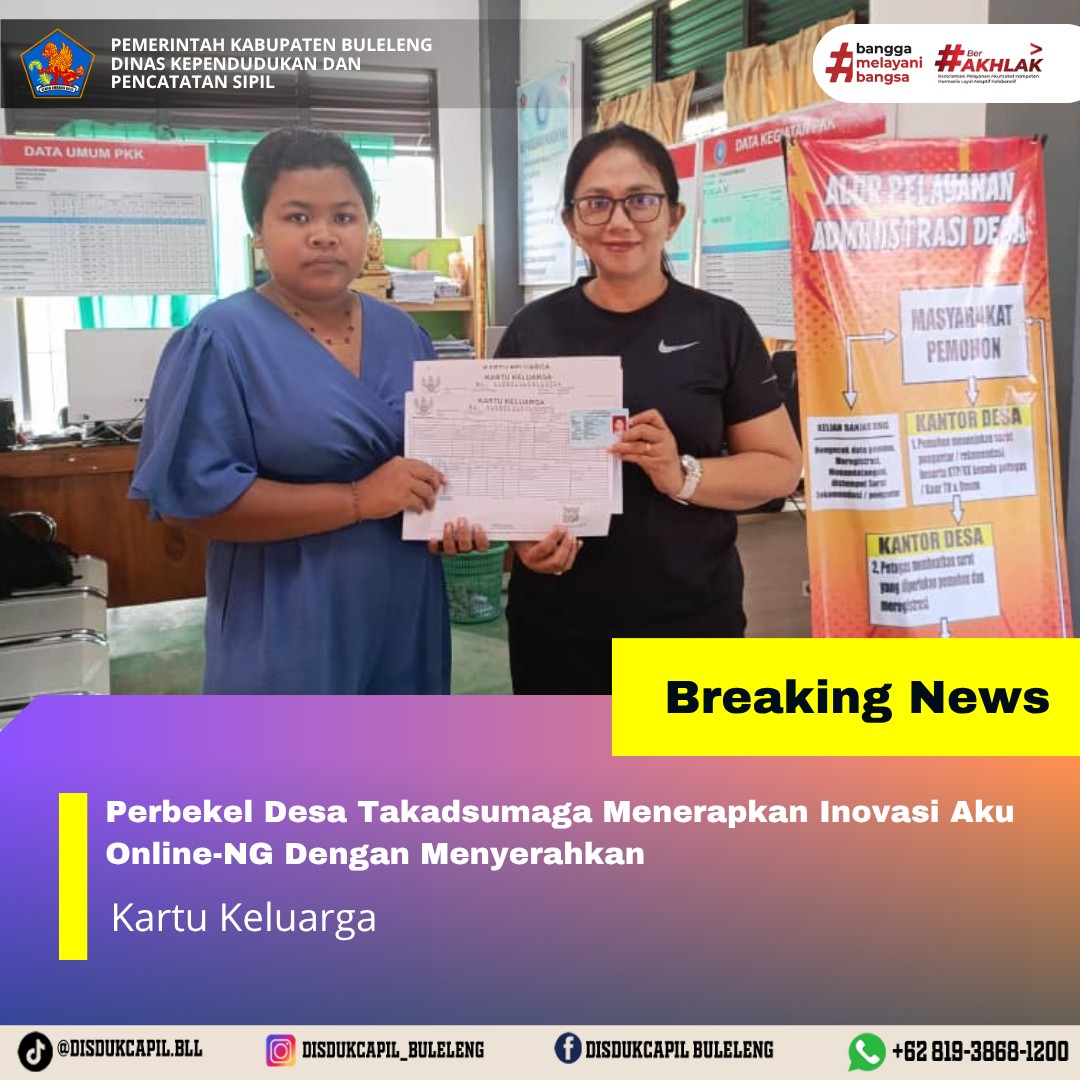 Pemerintah Kabupaten Buleleng melalui Dinas Kependudukan dan Pecatatan Sipil (Disdukcapil) Kabupaten Buleleng memaksimalkan serta mempermudah pelayanan kependudukan masyarakat dengan beberapa inovasi, melalui aplikasi AKU Online-NG. Dimana dalam penerapan aplikasi Aku Online-NG tersebut masyarakat tidak perlu lagi datang ke Dinas Dukcapil untuk melakukan pelayanan langsung cukup dengan datang ke Desa nanti akan dibantu oleh operator Desa masing-masing. Di Desa Tukadsumaga Kecamatan Gerokgak, telah diserahkan dokumen kependudukan berupa Kartu Keluarga atas nama I Nengah Selamat yang diserahkan oleh Perbekel Desa Tukadsumaga Anak Agung Sri Wathi kepada warga Desa Tukadsumaga, Jumat (31/10).