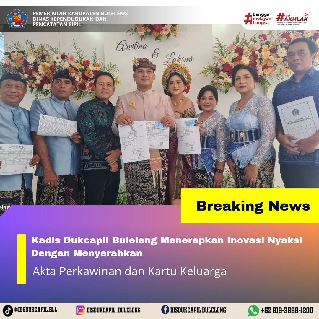 Pemerintah Kabupaten Buleleng melalui Dinas Kependudukan dan Pecatatan Sipil (Disdukcapil) Kabupaten Buleleng memaksimalkan serta mempermudah pelayanan kependudukan masyarakat dengan beberapa inovasi, yakni BALITA (Bayi Lahir Berakta), NYAKSI (Menyerahkan Akta Kawin Saat Acara Perkawinan) dan AKSAMA ( Akta Kematian Diserahkan Saat Masih Berduka) melalui aplikasi Aku Online-NG. Di Desa Banyuatis Kecamatan Banjar, telah diterapkan program NYAKSI (Menyerahkan Akta Kawin Saat Acara Perkawinan) yang dilakukan secara langsung oleh Kepala Dinas Kependudukan dan Pencatatan Sipil Kabupaten Buleleng Made Juartawan,S.STP,MM, dengan menyerahkan Akta Perkawinan atas nama Kadek Arvilino Baskara Adi Putra dengan Nyoman Shri Laksmi Suniati dan Kartu Keluarga kepada kedua mempelai dan Kartu Keluarga mempelai dan masing-masing orang tua mempelai, Jumat (3/10).