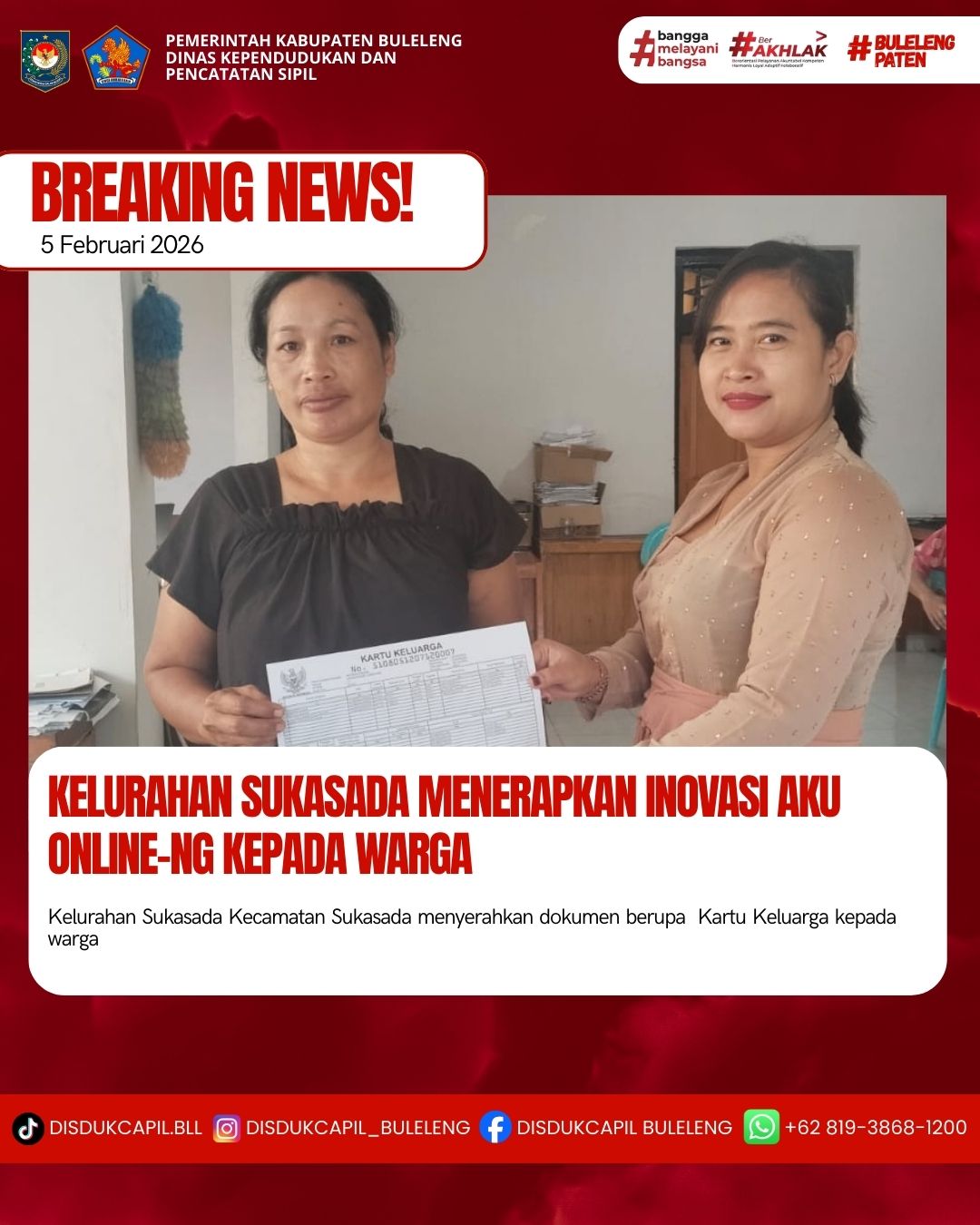 Pemerintah Kabupaten Buleleng melalui Dinas Kependudukan dan Pecatatan Sipil (Disdukcapil) Kabupaten Buleleng memaksimalkan serta mempermudah pelayanan kependudukan masyarakat dengan beberapa inovasi, melalui aplikasi AKU Online-NG. Dimana dalam penerapan aplikasi Aku Online-NG tersebut masyarakat tidak perlu lagi datang ke Dinas Dukcapil untuk melakukan pelayanan langsung cukup dengan datang ke Desa nanti akan dibantu oleh operator Desa masing-masing. Di Kelurahan Sukasada Kecamatan Sukasada, telah diserahkan dokumen kependudukan berupa Kartu Keluarga atas nama Nyoman Nindia warga Lingkungan Lumbanan, Kelurahan Sukasada yang diserahkan langsung oleh Operator Kelurahan Sukasada Kecamatan Sukasada, Kabupaten Buleleng, Kamis (5/2).