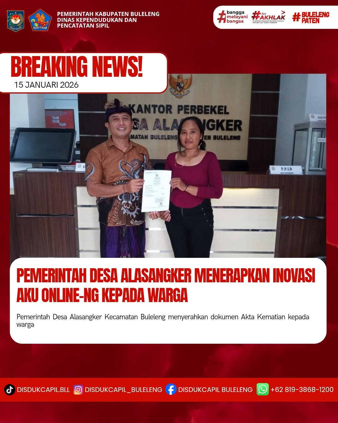 Pemerintah Kabupaten Buleleng melalui Dinas Kependudukan dan Pecatatan Sipil (Disdukcapil) Kabupaten Buleleng memaksimalkan serta mempermudah pelayanan kependudukan masyarakat dengan beberapa inovasi, melalui aplikasi AKU Online-NG. Dimana dalam penerapan aplikasi Aku Online-NG tersebut masyarakat tidak perlu lagi datang ke Dinas Dukcapil untuk melakukan pelayanan langsung cukup dengan datang ke Desa nanti akan dibantu oleh operator Desa masing-masing. Di Desa Alasangker Kecamatan Buleleng, telah diserahkan dokumen kependudukan berupa Akta Kematian warga Banjar Dinas Bengkel Desa Alasangker yang diserahkan oleh Pemerintah Desa Alasangker, Kamis (15/1).