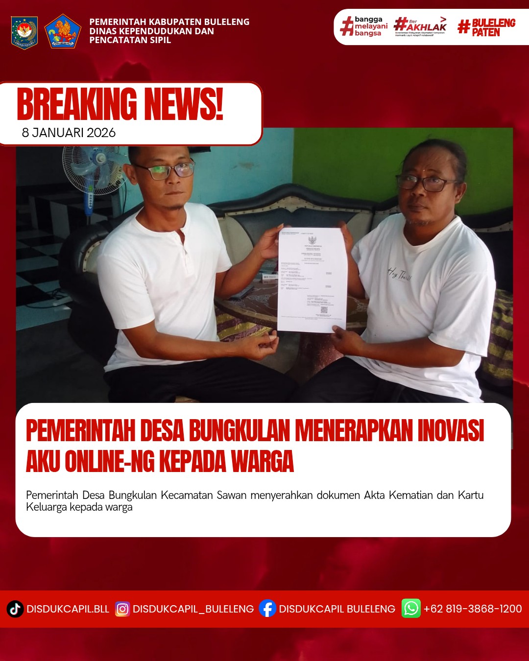 Pemerintah Kabupaten Buleleng melalui Dinas Kependudukan dan Pecatatan Sipil (Disdukcapil) Kabupaten Buleleng memaksimalkan serta mempermudah pelayanan kependudukan masyarakat dengan beberapa inovasi, melalui aplikasi AKU Online-NG. Dimana dalam penerapan aplikasi Aku Online-NG tersebut masyarakat tidak perlu lagi datang ke Dinas Dukcapil untuk melakukan pelayanan langsung cukup dengan datang ke Desa nanti akan dibantu oleh operator Desa masing-masing. Di Desa Bungkulan Kecamatan Sawan, telah diserahkan dokumen kependudukan berupa Akta Kematian dan Kartu Keluarga yang diserahkan oleh Kelian Banjar Dinas Punduh Sangsit di Desa Bungkulan Kecamatan Sawan, Kamis (8/1).