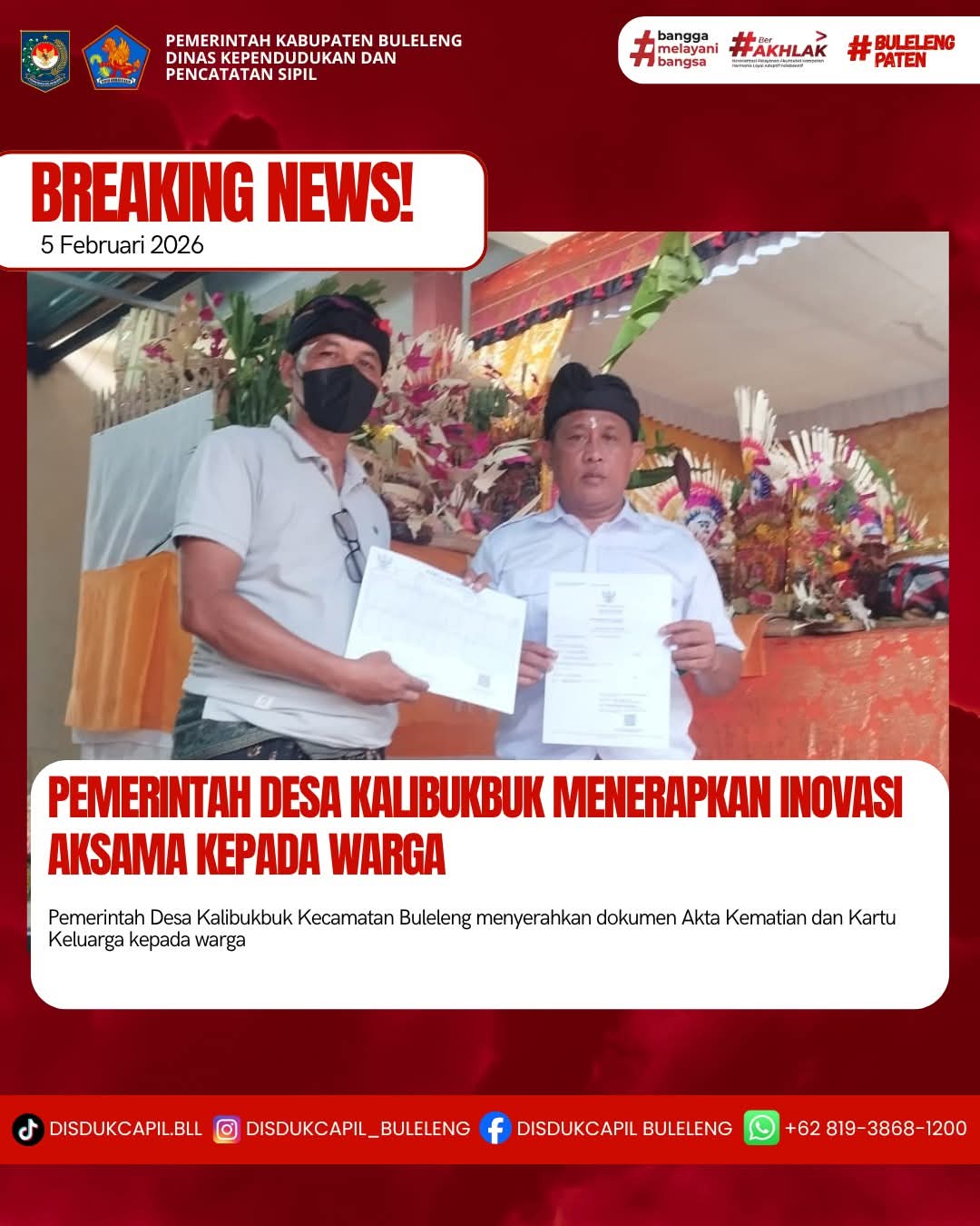 Pemerintah Kabupaten Buleleng melalui Dinas Kependudukan dan Pecatatan Sipil (Disdukcapil) Kabupaten Buleleng memaksimalkan serta mempermudah pelayanan kependudukan masyarakat dengan beberapa inovasi, yakni BALITA (Bayi Lahir Berakta), NYAKSI (Menyerahkan Akta Kawin Saat Acara Perkawinan) dan AKSAMA ( Akta Kematian Diserahkan Saat Masih Berduka) melalui aplikasi Aku Online. Di Desa Kalibukbuk Kecamatan Buleleng, telah diterapkan program Aksama (Akta Kematian Diserahkan Saat Masih Berduka) yang dilakukan secara langsung oleh Kadus Banyualit Desa Kalibukbuk menyerahkan Akta Kematian atas nama Ketut Wirana dan Kartu Keluarga atas nama Luh Cita di Desa Kalibukbuk, Kecamatan Buleleng, Kamis (5/2).