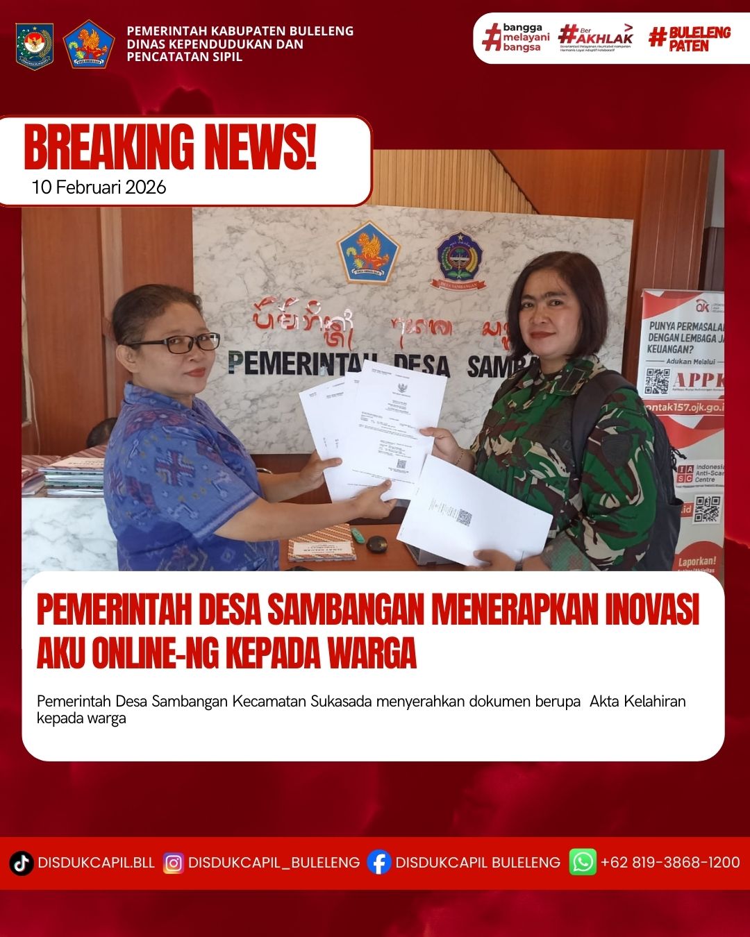 Pemerintah Kabupaten Buleleng melalui Dinas Kependudukan dan Pecatatan Sipil (Disdukcapil) Kabupaten Buleleng memaksimalkan serta mempermudah pelayanan kependudukan masyarakat dengan beberapa inovasi, melalui aplikasi AKU Online-NG. Dimana dalam penerapan aplikasi Aku Online-NG tersebut masyarakat tidak perlu lagi datang ke Dinas Dukcapil untuk melakukan pelayanan langsung cukup dengan datang ke Desa nanti akan dibantu oleh operator Desa masing-masing. Di Desa Sambangan Kecamatan Sukasada, telah diserahkan dokumen kependudukan berupa Akta Kelahiran atas nama Ida Bagus Astawa, Ida Ayu Gita Prameswari, Ida Bagus Ade Putra Indrastawa dan Ida Bagus Raka Putra Indrastawa diserahkan oleh Kasi Pemerintahan Desa Sambangan bertempat di Kantor Perbekel Desa Sambangan, Kecamatan Sukasada, Kabupaten Buleleng, Selasa (10/2).
