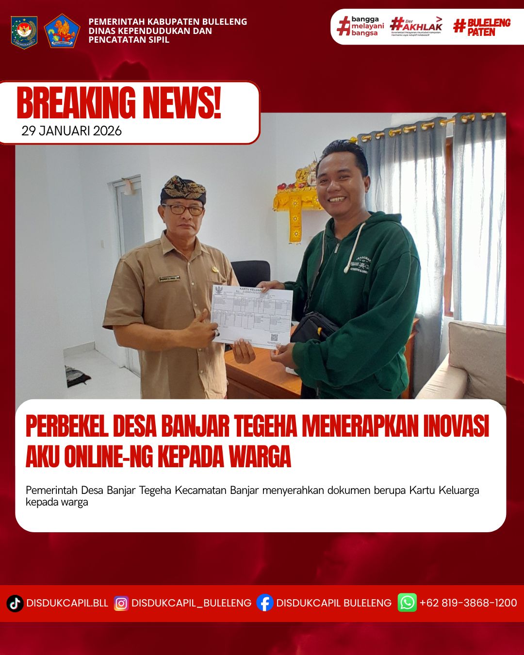 Pemerintah Kabupaten Buleleng melalui Dinas Kependudukan dan Pecatatan Sipil (Disdukcapil) Kabupaten Buleleng memaksimalkan serta mempermudah pelayanan kependudukan masyarakat dengan beberapa inovasi, melalui aplikasi AKU Online-NG. Dimana dalam penerapan aplikasi Aku Online-NG tersebut masyarakat tidak perlu lagi datang ke Dinas Dukcapil untuk melakukan pelayanan langsung cukup dengan datang ke Desa nanti akan dibantu oleh operator Desa masing-masing. Di Desa Banjar Tegeha Kecamatan Banjar, telah diserahkan dokumen kependudukan berupa Kartu Keluarga atas nama Agus Hartawan yang diserahkan secara langsung oleh Perbekel Desa Banjar Tegeha Ida Bagus Komang Sistiadi, Kamis (29/1).