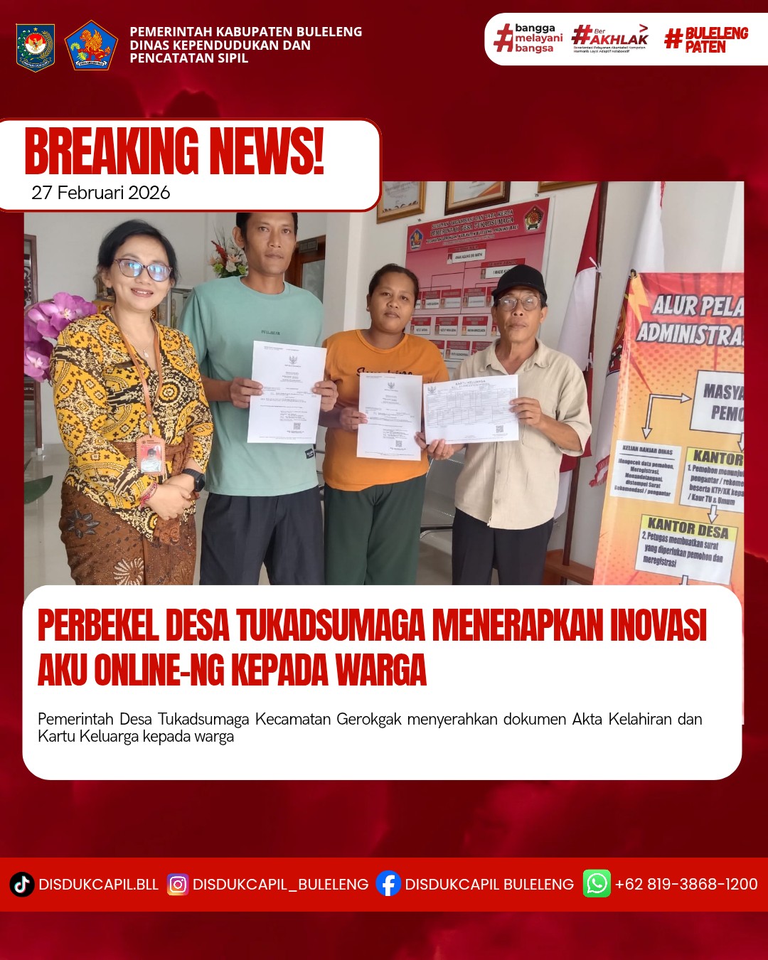 Pemerintah Kabupaten Buleleng melalui Dinas Kependudukan dan Pecatatan Sipil (Disdukcapil) Kabupaten Buleleng memaksimalkan serta mempermudah pelayanan kependudukan masyarakat dengan beberapa inovasi, melalui aplikasi AKU Online-NG. Dimana dalam penerapan aplikasi Aku Online-NG tersebut masyarakat tidak perlu lagi datang ke Dinas Dukcapil untuk melakukan pelayanan langsung cukup dengan datang ke Desa nanti akan dibantu oleh operator Desa masing-masing. Di Desa Tukadsumaga Kecamatan Gerokgak, telah diserahkan dokumen kependudukan berupa Akta Kelahiran dan Kartu Keluarga atas nama I Putu Budiarta dan Ni Putu Nila Suardewi yang diserahkan oleh Perbekel Desa Tukadsumaga Anak Agung Sri Wathi didampingi oleh Kelian Banjar Dinas Berawah di Desa Tukadsumaga, Kamis (26/2).