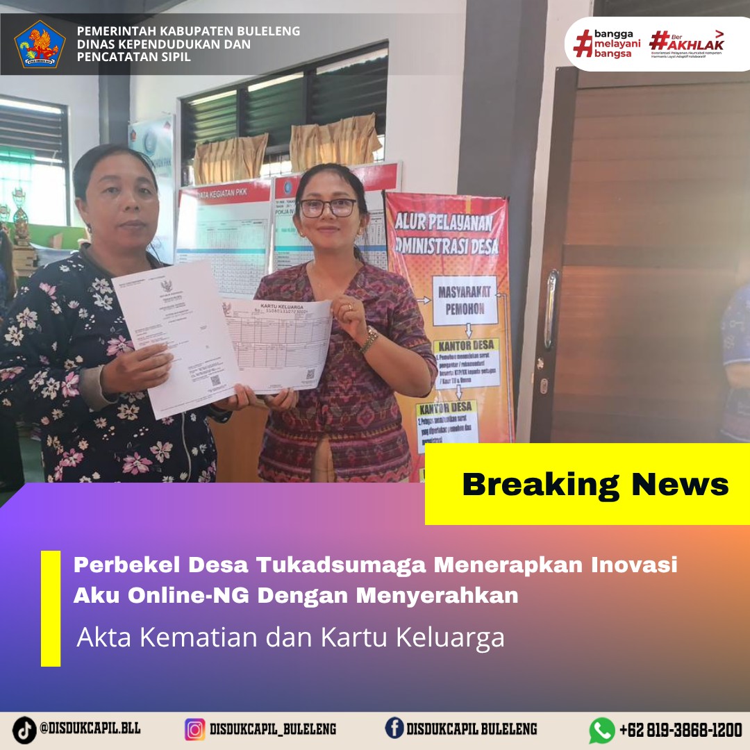 Pemerintah Kabupaten Buleleng melalui Dinas Kependudukan dan Pecatatan Sipil (Disdukcapil) Kabupaten Buleleng memaksimalkan serta mempermudah pelayanan kependudukan masyarakat dengan beberapa inovasi, melalui aplikasi AKU Online. Dimana dalam penerapan aplikasi Aku Online tersebut masyarakat tidak perlu lagi datang ke Dinas Dukcapil untuk melakukan pelayanan langsung cukup dengan datang ke Desa nanti akan dibantu oleh operator Desa masing-masing. Di Desa Tukadsumaga Kecamatan Gerokgak telah diserahkan dokumen kependudukan berupa Akta Kematian atas nama Ni Luh Ganing dan Kartu Keluarga atas nama Ni Nyoman Kerti yang diserahkan oleh Perbekel Desa Tukadsumaga Kecamatan Gerokgak Anak Agung Sri Wathi kepada warga Banjar Dinas Buluh Desa Tukadsumaga, Selasa (14/10).