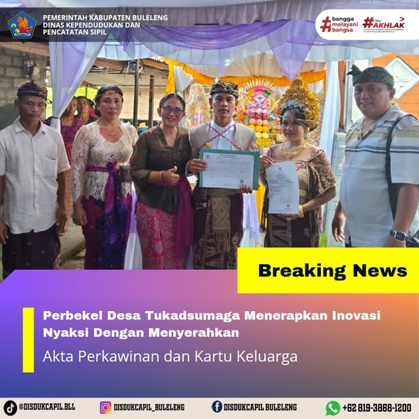 Pemerintah Kabupaten Buleleng melalui Dinas Kependudukan dan Pecatatan Sipil (Disdukcapil) Kabupaten Buleleng memaksimalkan serta mempermudah pelayanan kependudukan masyarakat dengan beberapa inovasi, yakni BALITA (Bayi Lahir Berakta), NYAKSI (Menyerahkan Akta Kawin Saat Acara Perkawinan) dan AKSAMA ( Akta Kematian Diserahkan Saat Masih Berduka) melalui aplikasi Aku Online-NG. Di Desa Kayuputih Kecamatan Sukasada, telah diterapkan program NYAKSI (Menyerahkan Akta Perkawinan Saat Acara Perkawinan) yang dilakukan secara langsung oleh Perbekel Desa Tukadsumaga Anak Agung Sri Wathi di dampingi Kelian Banjar Dinas Buluh Ketut Artaya dengan menyerahkan Akta Perkawinan atas nama I Gede Eka Apriana dengan Kadek Wahyuni Kartika Sari dan Kartu Keluarga kepada kedua mempelai dan masing-masing orang tua mempelai di Banjar Dinas Buluh Desa Tukadsumaga Kecamatan Gerogak, Jumat (7/11).