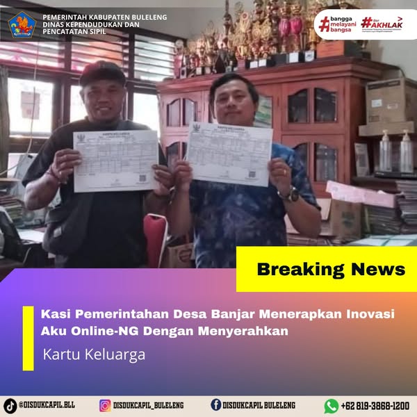 Pemerintah Kabupaten Buleleng melalui Dinas Kependudukan dan Pecatatan Sipil (Disdukcapil) Kabupaten Buleleng memaksimalkan serta mempermudah pelayanan kependudukan masyarakat dengan beberapa inovasi, melalui aplikasi AKU Online-NG. Dimana dalam penerapan aplikasi Aku Online-NG tersebut masyarakat tidak perlu lagi datang ke Dinas Dukcapil untuk melakukan pelayanan langsung cukup dengan datang ke Desa nanti akan dibantu oleh operator Desa masing-masing. Di Desa Banjar Kecamatan Banjar, telah diserahkan dokumen kependudukan berupa Kartu Keluarga atas nama Ida Putu Suarmaya yang beralamat di Banjar Dinas Pegentengan, Desa Banjar yang diserahkan langsung oleh Kasi Pemerintahan Desa Banjar, Selasa (26/8).
