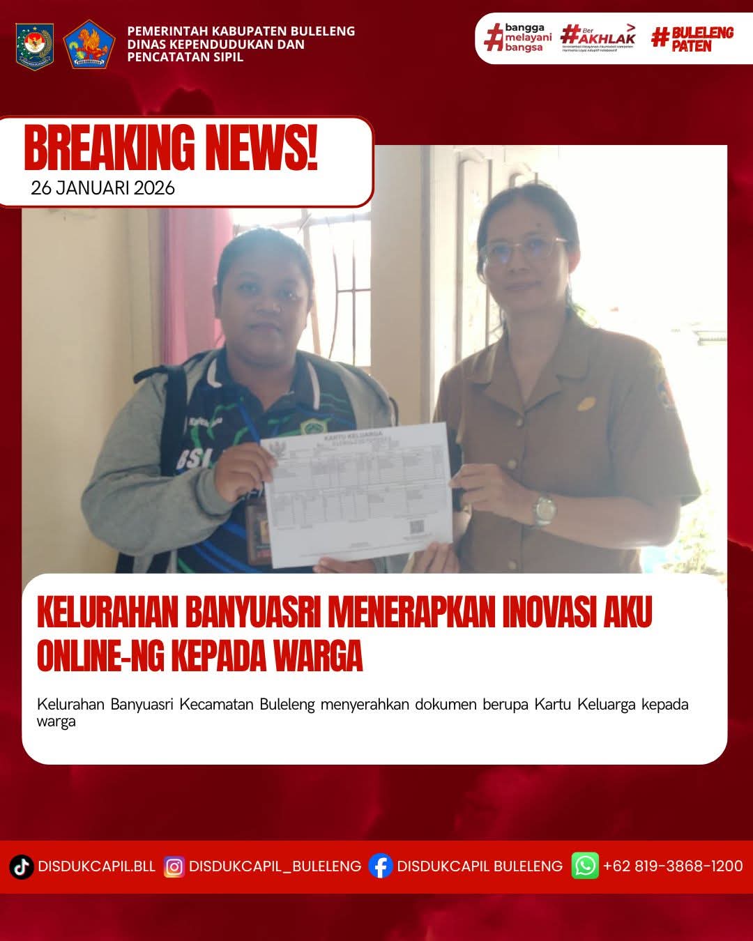 Pemerintah Kabupaten Buleleng melalui Dinas Kependudukan dan Pecatatan Sipil (Disdukcapil) Kabupaten Buleleng memaksimalkan serta mempermudah pelayanan kependudukan masyarakat dengan beberapa inovasi, melalui aplikasi AKU Online-NG. Dimana dalam penerapan aplikasi Aku Online-NG tersebut masyarakat tidak perlu lagi datang ke Dinas Dukcapil untuk melakukan pelayanan langsung cukup dengan datang ke Desa nanti akan dibantu oleh operator Desa masing-masing. Di Kelurahan Banyuasri Kecamatan Buleleng, telah diserahkan dokumen kependudukan berupa Kartu Keluarga atas nama Ketut Budayasa yang beralamat di Jalan Lingga Gang III Kelurahan Banyuasri yang diserahkan langsung oleh Kasi Pelayanan Umum Kelurahan Banyuasri, Kecamatan Buleleng, Kabupaten Buleleng, Senin (26/1).