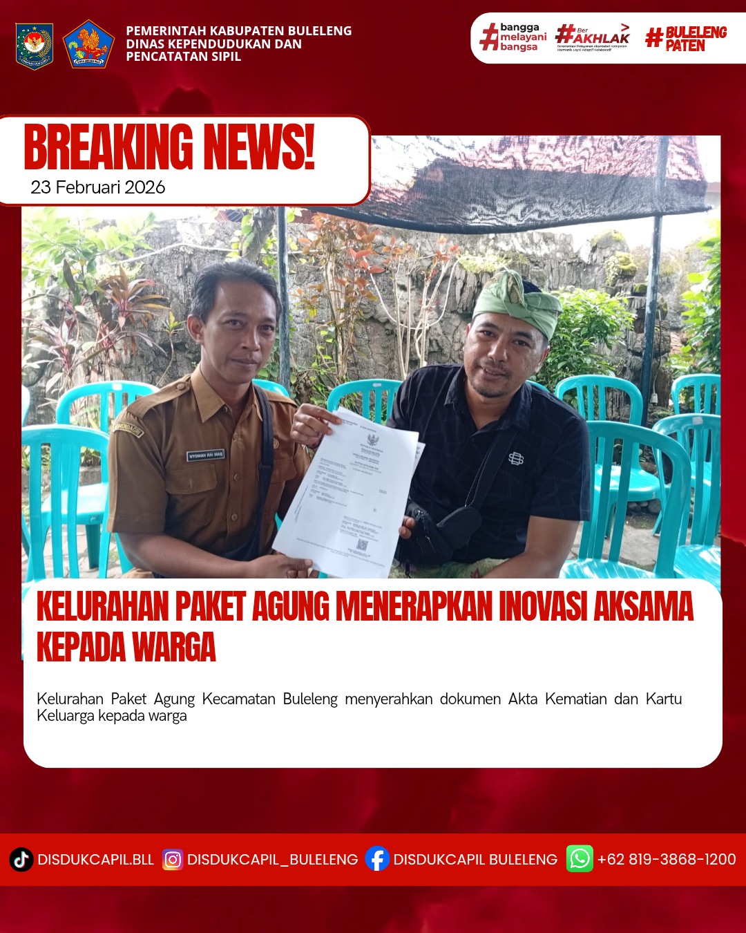 Pemerintah Kabupaten Buleleng melalui Dinas Kependudukan dan Pecatatan Sipil (Disdukcapil) Kabupaten Buleleng memaksimalkan serta mempermudah pelayanan kependudukan masyarakat dengan beberapa inovasi, yakni BALITA (Bayi Lahir Berakta), NYAKSI (Menyerahkan Akta Kawin Saat Acara Perkawinan) dan AKSAMA ( Akta Kematian Diserahkan Saat Masih Berduka) melalui aplikasi Aku Online-NG. Di Kelurahan Paket Agung Kecamatan Buleleng, telah diterapkan program Aksama (Akta Kematian Diserahkan Saat Masih Berduka) yang dilakukan secara langsung oleh Kaling Kelurahan Paket Agung dengan menyerahkan Akta Kematian atas nama Nyoman Suyatna dan Kartu Keluarga kepada keluarga almarhum di rumah duka di Kelurahan Paket Agung, Senin (23/2).
