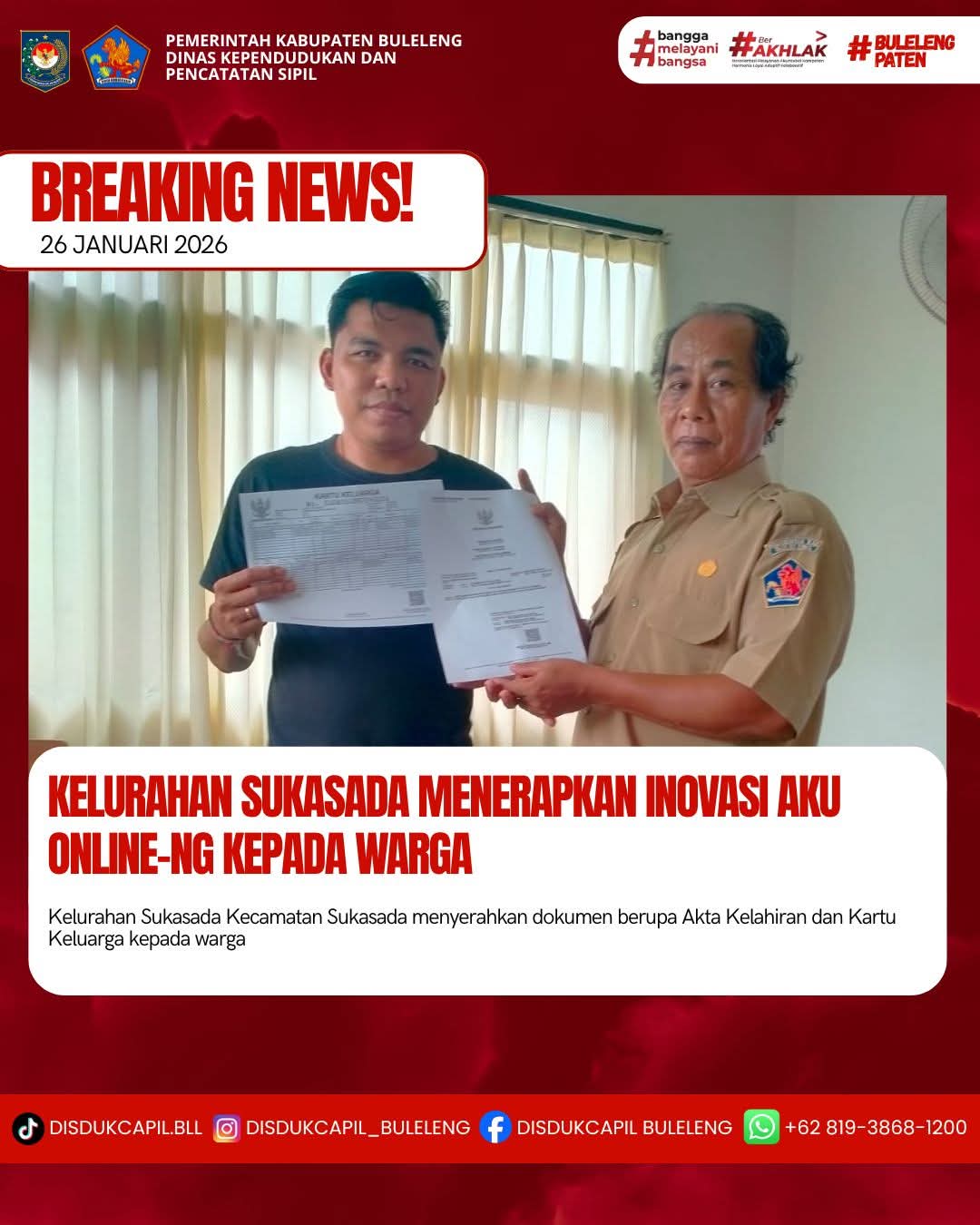 Pemerintah Kabupaten Buleleng melalui Dinas Kependudukan dan Pecatatan Sipil (Disdukcapil) Kabupaten Buleleng memaksimalkan serta mempermudah pelayanan kependudukan masyarakat dengan beberapa inovasi, melalui aplikasi AKU Online-NG. Dimana dalam penerapan aplikasi Aku Online-NG tersebut masyarakat tidak perlu lagi datang ke Dinas Dukcapil untuk melakukan pelayanan langsung cukup dengan datang ke Desa nanti akan dibantu oleh operator Desa masing-masing. Di Kelurahan Sukasada Kecamatan Sukasada, telah diserahkan dokumen kependudukan berupa Akta Kelahiran dan Kartu Keluarga atas nama Gede Juni Aryana warga Lingkungan Bantangbanua, Kelurahan Sukasada yang diserahkan langsung oleh staf Kelurahan Sukasada Kecamatan Sukasada, Kabupaten Buleleng, Senin (26/1).