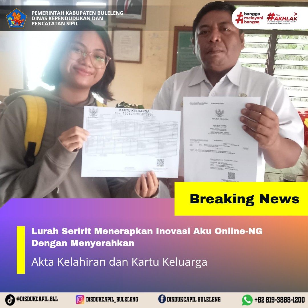 Pemerintah Kabupaten Buleleng melalui Dinas Kependudukan dan Pecatatan Sipil (Disdukcapil) Kabupaten Buleleng memaksimalkan serta mempermudah pelayanan kependudukan masyarakat dengan beberapa inovasi, melalui aplikasi AKU Online-NG. Dimana dalam penerapan aplikasi Aku Online-NG tersebut masyarakat tidak perlu lagi datang ke Dinas Dukcapil untuk melakukan pelayanan langsung cukup dengan datang ke Desa nanti akan dibantu oleh operator Desa masing-masing. Di Kelurahan Seririt Kecamatan Seririt, telah diserahkan dokumen kependudukan berupa Akta Kelahiran atas nama Luh Suwiti dan Kartu Keluarga atas nama I Ketut Megawan yang diserahkan langsung oleh Lurah Seririt Kecamatan Seririt, Kabupaten Buleleng, Rabu (3/12).