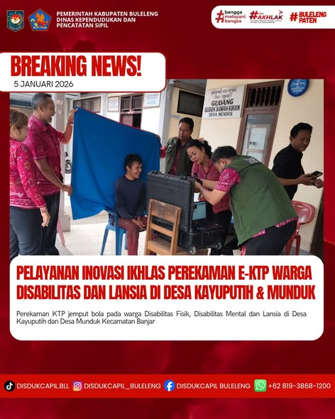 Pada hari ini Selasa, 6 Januari 2026 Dinas Kependudukan dan Pencatatan Sipil Kabupaten Buleleng melaksanakan penerapan Inovasi Ikhlas dengan melakukan jemput bola kepada masyarakat untuk melakukan perekaman KTP-El kepada warga Disabilitas Fisik, Disabilitas Mental dan Lansia di Desa Kayuputih dan Desa Munduk Kecamatan Banjar atas nama :