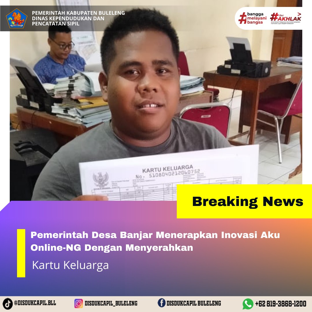 Pemerintah Kabupaten Buleleng melalui Dinas Kependudukan dan Pecatatan Sipil (Disdukcapil) Kabupaten Buleleng memaksimalkan serta mempermudah pelayanan kependudukan masyarakat dengan beberapa inovasi, melalui aplikasi AKU Online-NG. Dimana dalam penerapan aplikasi Aku Online-NG tersebut masyarakat tidak perlu lagi datang ke Dinas Dukcapil untuk melakukan pelayanan langsung cukup dengan datang ke Desa nanti akan dibantu oleh operator Desa masing-masing. Di Desa Banjar Kecamatan Banjar, telah diserahkan dokumen kependudukan berupa Kartu Keluarga atas nama DIMAS ARIANTO yang beralamat di Banjar Dinas Ambengan, Desa Banjar yang diserahkan langsung oleh Pemerintahan Desa Banjar, Rabu (20/8).