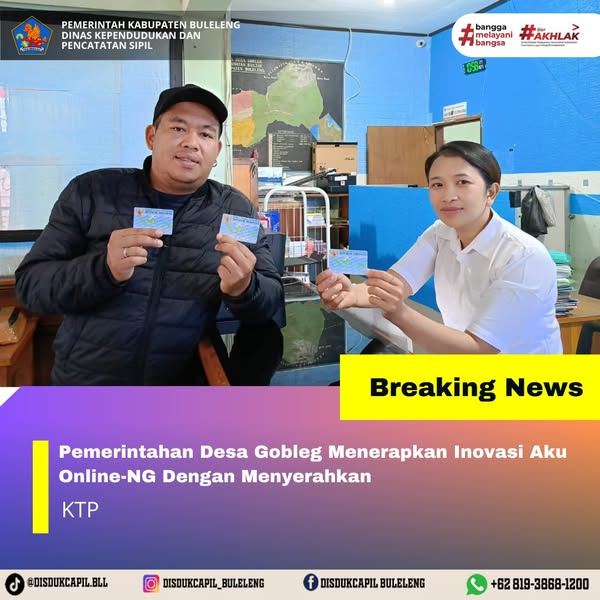 Pemerintah Kabupaten Buleleng melalui Dinas Kependudukan dan Pecatatan Sipil (Disdukcapil) Kabupaten Buleleng memaksimalkan serta mempermudah pelayanan kependudukan masyarakat dengan beberapa inovasi, melalui aplikasi AKU Online-NG. Dimana dalam penerapan aplikasi Aku Online-NG tersebut masyarakat tidak perlu lagi datang ke Dinas Dukcapil untuk melakukan pelayanan langsung cukup dengan datang ke Desa nanti akan dibantu oleh operator Desa masing-masing. Di Desa Gobleg Kecamatan Banjar, telah diserahkan dokumen kependudukan berupa KTP atas nama Putu Berlin, Made swartini, Gusti ayu Trisnawati yang diserahkan langsung oleh staf administrasi Desa Gobleg bertempat di Kantor Perbekel Desa Gobleg, Kecamatan Banjar, Kabupaten Buleleng, Rabu (27/8).