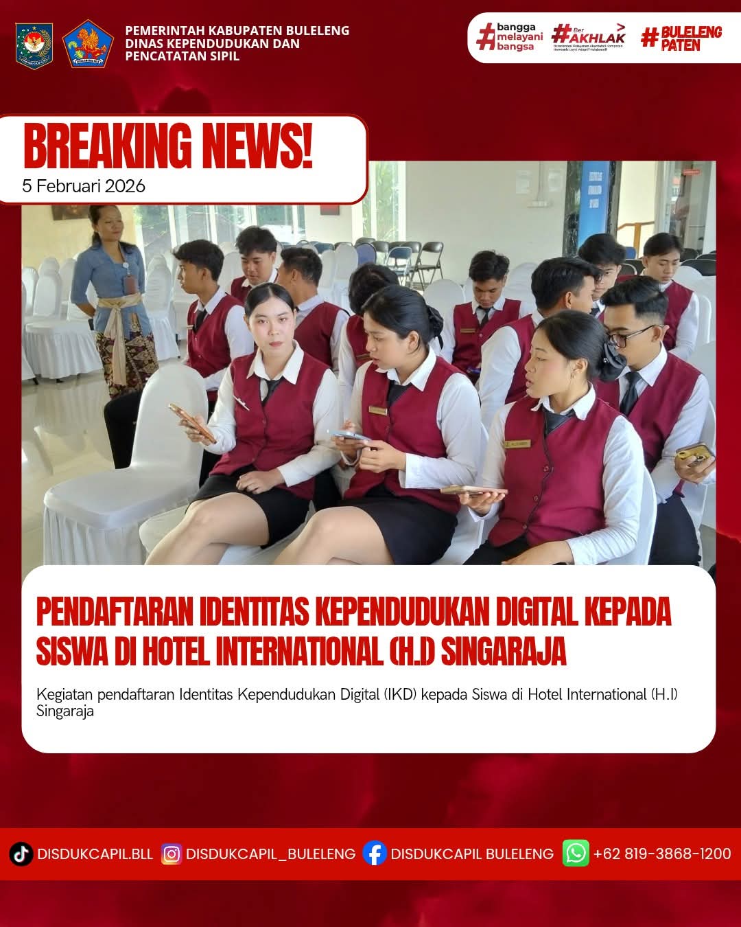 Menerapkan aturan pemerintah tersebut, Dinas Kependudukan dan Pencatatan Sipil Kabupaten Buleleng menyelenggarakan Pendaftaran Identitas Kependudukan Digital ke sekolah-sekolah, Dinas, Lembaga dan Perusahaan secara bergilir setiap harinya. Kali ini pelaksanaan pendaftaran Identitas Kependudukan Digital kepada siswa yang dilaksanakan di Hotel International (H.I) Singaraja Kelurahan Sukasada, Rabu (4/2).