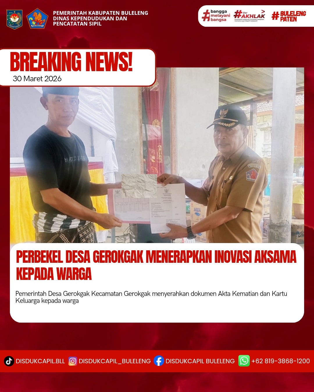 Pemerintah Kabupaten Buleleng melalui Dinas Kependudukan dan Pecatatan Sipil (Disdukcapil) Kabupaten Buleleng memaksimalkan serta mempermudah pelayanan kependudukan masyarakat dengan beberapa inovasi, melalui aplikasi AKU Online-NG. Dimana dalam penerapan aplikasi Aku Online-NG tersebut masyarakat tidak perlu lagi datang ke Dinas Dukcapil untuk melakukan pelayanan langsung, cukup dengan datang ke Desa nanti akan dibantu oleh operator Desa masing-masing. Di Desa Gerokgak Kecamatan Gerokgak, telah diserahkan dokumen kependudukan berupa Akta Kematian atas nama Nengah Sedana dan Kartu Keluarga atas nama Luh Tangsi Banjar Dinas Batuagung Pidada, yang diserahkan langsung oleh Perbekel Desa Gerokgak I Nyoman Wijaya di Desa Gerokgak, Kecamatan Gerokgak, Kabupaten Buleleng, Senin (30/3).