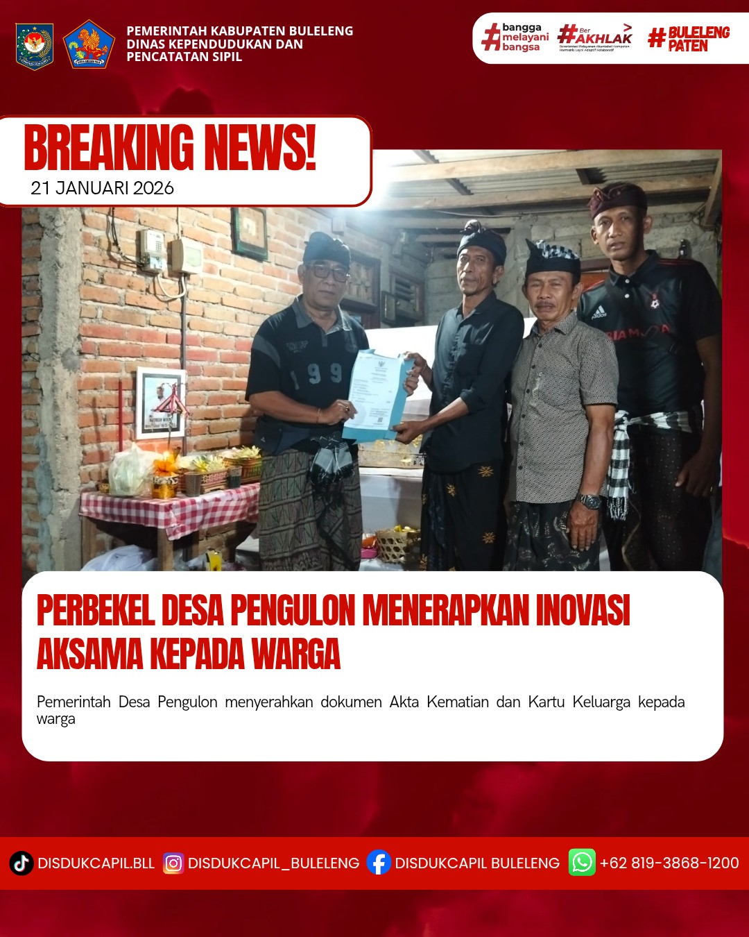 Pemerintah Kabupaten Buleleng melalui Dinas Kependudukan dan Pecatatan Sipil (Disdukcapil) Kabupaten Buleleng memaksimalkan serta mempermudah pelayanan kependudukan masyarakat dengan beberapa inovasi, yakni BALITA (Bayi Lahir Berakta), NYAKSI (Menyerahkan Akta Kawin Saat Acara Perkawinan) dan AKSAMA ( Akta Kematian Diserahkan Saat Masih Berduka) melalui aplikasi Aku Online-NG. Di Desa Pengulon Kecamatan Gerokgak, telah diterapkan program Aksama (Akta Kematian Diserahkan Saat Masih Berduka) yang dilakukan secara langsung oleh Perbekel Desa Pengulon Drs. I Nyoman Juliana didampingi oleh KBD Bukit Sari Putu Darmada dan dan Kelian Desa Adat Pengulon dengan menyerahkan Akta Kematian atas nama Nyoman Wirat dan Kartu Keluarga kepada pihak keluarga di rumah duka di Desa Pengulon, Rabu (21/1).