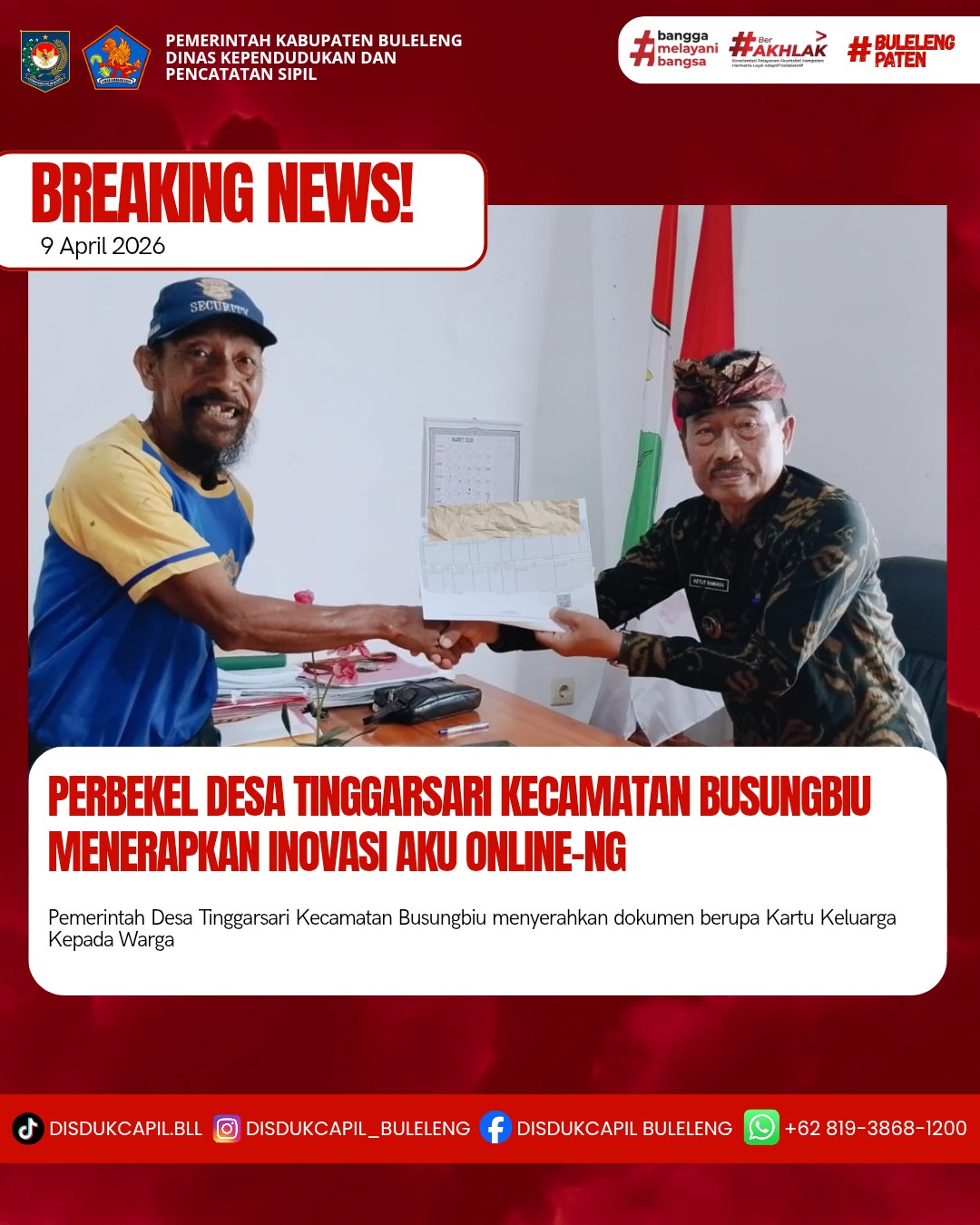 Pemerintah Kabupaten Buleleng melalui Dinas Kependudukan dan Pecatatan Sipil (Disdukcapil) Kabupaten Buleleng memaksimalkan serta mempermudah pelayanan kependudukan masyarakat dengan beberapa inovasi, melalui aplikasi AKU Online-NG. Dimana dalam penerapan aplikasi Aku Online-NG tersebut masyarakat tidak perlu lagi datang ke Dinas Dukcapil untuk melakukan pelayanan langsung cukup dengan datang ke Desa nanti akan dibantu oleh operator Desa masing-masing. Di Desa Tinggarsari Kecamatan Busungbiu, telah diserahkan dokumen kependudukan berupa Kartu Keluarga atas nama PUTU BUDIARTINI yang diserahkan secara lansung oleh Perbekel Desa Tinggarsari KETUT SAMIASA di Desa Tinggarsari, Kamis (9/4).