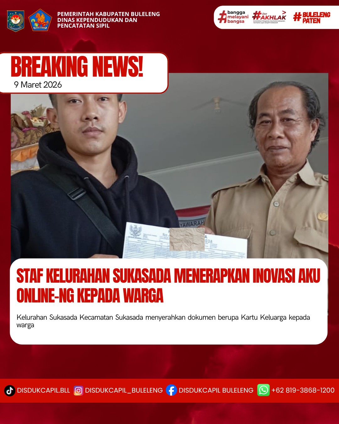 Pemerintah Kabupaten Buleleng melalui Dinas Kependudukan dan Pecatatan Sipil (Disdukcapil) Kabupaten Buleleng memaksimalkan serta mempermudah pelayanan kependudukan masyarakat dengan beberapa inovasi, melalui aplikasi AKU Online-NG. Dimana dalam penerapan aplikasi Aku Online-NG tersebut masyarakat tidak perlu lagi datang ke Dinas Dukcapil untuk melakukan pelayanan langsung cukup dengan datang ke Desa nanti akan dibantu oleh operator Desa masing-masing. Di Kelurahan Sukasada Kecamatan Sukasada, telah diserahkan dokumen kependudukan berupa Kartu Keluarga atas nama Putu Gelgel Putrayasa warga Lingkungan Bakung, Kelurahan Sukasada yang diserahkan langsung oleh Staf Kelurahan Sukasada Kecamatan Sukasada, Kabupaten Buleleng, Selasa (9/3).