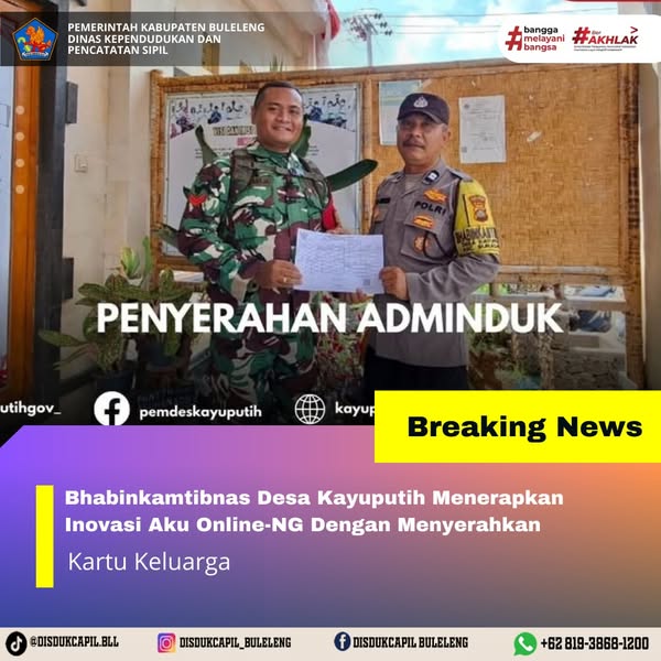Pemerintah Kabupaten Buleleng melalui Dinas Kependudukan dan Pecatatan Sipil (Disdukcapil) Kabupaten Buleleng memaksimalkan serta mempermudah pelayanan kependudukan masyarakat dengan beberapa inovasi, melalui aplikasi AKU Online-NG. Dimana dalam penerapan aplikasi Aku Online-NG tersebut masyarakat tidak perlu lagi datang ke Dinas Dukcapil untuk melakukan pelayanan langsung cukup dengan datang ke Desa nanti akan dibantu oleh operator Desa masing-masing. Di Desa Kayuputih Kecamatan Sukasada, telah diserahkan dokumen kependudukan berupa Kartu Keluarga atas nama Kadek Wiratmaja yang diserahkan langsung oleh Bhabinkamtibnas Desa Kayuputih Kecamatan Sukasada bertempat di kantor Perbekel Desa Kayuputih, Kecamatan Sukasada, Kabupaten Buleleng, Jumat (22/8).