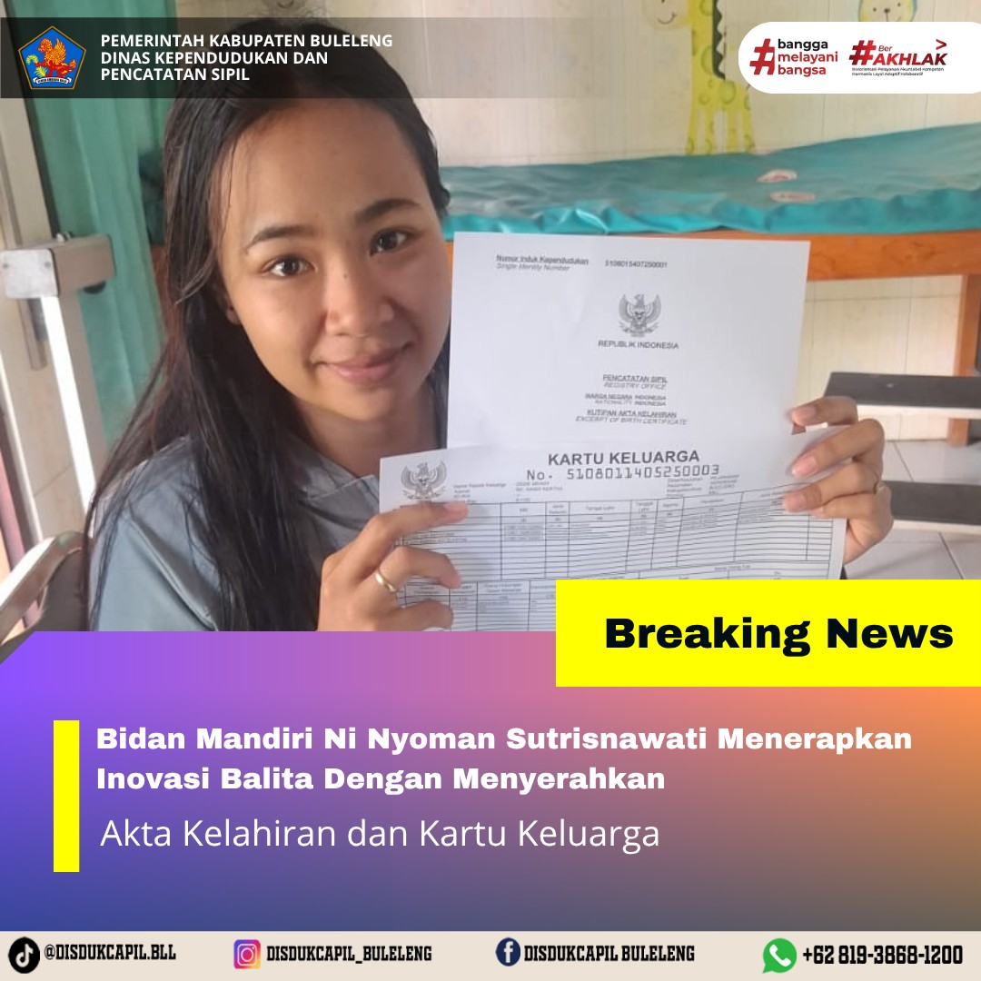 Pemerintah Kabupaten Buleleng melalui Dinas Kependudukan dan Pencatatan Sipil (Disdukcapil) Kabupaten Buleleng memaksimalkan serta mempermudah pelayanan kependudukan masyarakat dengan beberapa inovasi, yakni BALITA (Bayi Lahir Berakta), NYAKSI (Menyerahkan Akta Kawin Saat Acara Perkawinan) dan AKSAMA ( Akta Kematian Diserahkan Saat Masih Berduka) melalui aplikasi Aku Online-NG. Di Desa Pejarakan, Kecamatan Gerokgak, telah diterapkan inovasi pelayanan BALITA (Bayi Lahir Berakta) dengan menyerahkan Akta Kelahiran dan Kartu Keluarga (KK) yang dilakukan secara langsung oleh Bidan Mandiri Ni Nyoman Sutrisnawati kepada masyarakat yang baru memiliki bayi, Rabu (1/10).