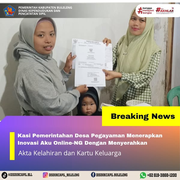 Pemerintah Kabupaten Buleleng melalui Dinas Kependudukan dan Pecatatan Sipil (Disdukcapil) Kabupaten Buleleng memaksimalkan serta mempermudah pelayanan kependudukan masyarakat dengan beberapa inovasi, melalui aplikasi AKU Online-NG. Dimana dalam penerapan aplikasi Aku Online-NG tersebut masyarakat tidak perlu lagi datang ke Dinas Dukcapil untuk melakukan pelayanan langsung cukup dengan datang ke Desa nanti akan dibantu oleh operator Desa masing-masing. Di Desa Pegayaman Kecamatan Sukasada, telah diserahkan dokumen kependudukan berupa Akta Kelahiran dan Kartu Keluarga kepada warga atas nama NYOMAN MAHMULAH yang beralamat di Banjar Dinas Amertasari Desa Pegayaman yang diserahkan langsung oleh Kasi Pemerintahan Desa Pegayaman, Kamis (7/8).