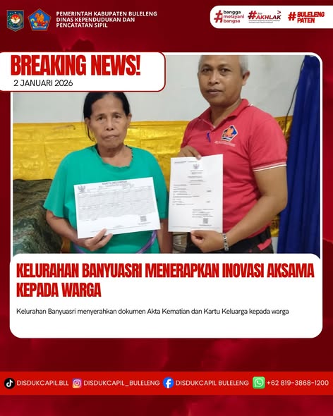 Pemerintah Kabupaten Buleleng melalui Dinas Kependudukan dan Pecatatan Sipil (Disdukcapil) Kabupaten Buleleng memaksimalkan serta mempermudah pelayanan kependudukan masyarakat dengan beberapa inovasi, yakni BALITA (Bayi Lahir Berakta), NYAKSI (Menyerahkan Akta Kawin Saat Acara Perkawinan) dan AKSAMA ( Akta Kematian Diserahkan Saat Masih Berduka) melalui aplikasi Aku Online-NG. Di Kelurahan Banyuasri Kecamatan Buleleng, telah diterapkan program Aksama (Akta Kematian Diserahkan Saat Masih Berduka) yang dilakukan secara langsung oleh Kelurahan Banyuasri Kecamatan Buleleng dengan menyerahkan Akta Kematian atas nama Nyoman Sedana dan Kartu Keluarga kepada keluarga almarhum di Rumah Duka di Kelurahan Banyuasri, Jumat (2/1).