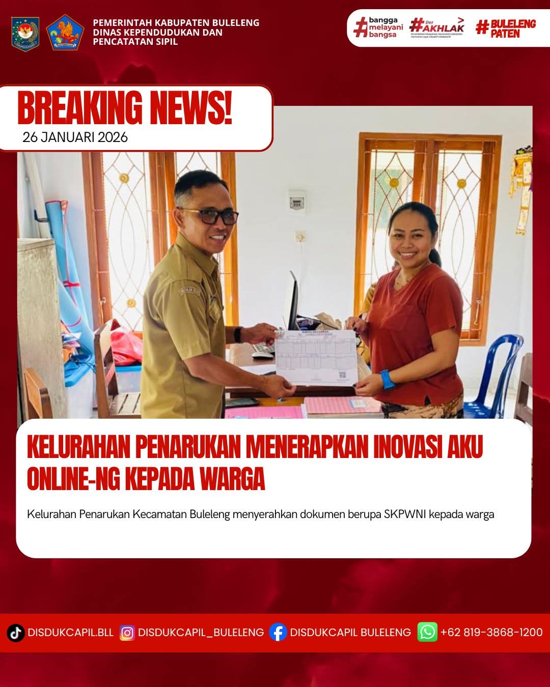Pemerintah Kabupaten Buleleng melalui Dinas Kependudukan dan Pecatatan Sipil (Disdukcapil) Kabupaten Buleleng memaksimalkan serta mempermudah pelayanan kependudukan masyarakat dengan beberapa inovasi, melalui aplikasi AKU Online-NG. Dimana dalam penerapan aplikasi Aku Online-NG tersebut masyarakat tidak perlu lagi datang ke Dinas Dukcapil untuk melakukan pelayanan langsung cukup dengan datang ke Desa nanti akan dibantu oleh operator Desa masing-masing. Di Kelurahan Penarukan Kecamatan Buleleng, telah diserahkan dokumen kependudukan berupa SKPWNI atas nama Putu Eka Juliastuti yang beralamat di Kelurahan Penarukan yang diserahkan langsung oleh Kelurahan Penarukan, Kecamatan Buleleng, Kabupaten Buleleng, Senin (26/1).