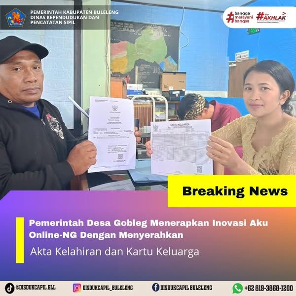 Pemerintah Kabupaten Buleleng melalui Dinas Kependudukan dan Pecatatan Sipil (Disdukcapil) Kabupaten Buleleng memaksimalkan serta mempermudah pelayanan kependudukan masyarakat dengan beberapa inovasi, melalui aplikasi AKU Online-NG. Dimana dalam penerapan aplikasi Aku Online-NG tersebut masyarakat tidak perlu lagi datang ke Dinas Dukcapil untuk melakukan pelayanan langsung cukup dengan datang ke Desa nanti akan dibantu oleh operator Desa masing-masing. Di Desa Gobleg Kecamatan Banjar, telah diserahkan dokumen kependudukan berupa Akta Kelahiran dan Kartu Keluarga atas nama Putu Budiasa yang diserahkan langsung oleh staf administrasi Desa Gobleg bertempat di Kantor Perbekel Desa Gobleg, Kecamatan Banjar, Kabupaten Buleleng, Kamis, (16/10).