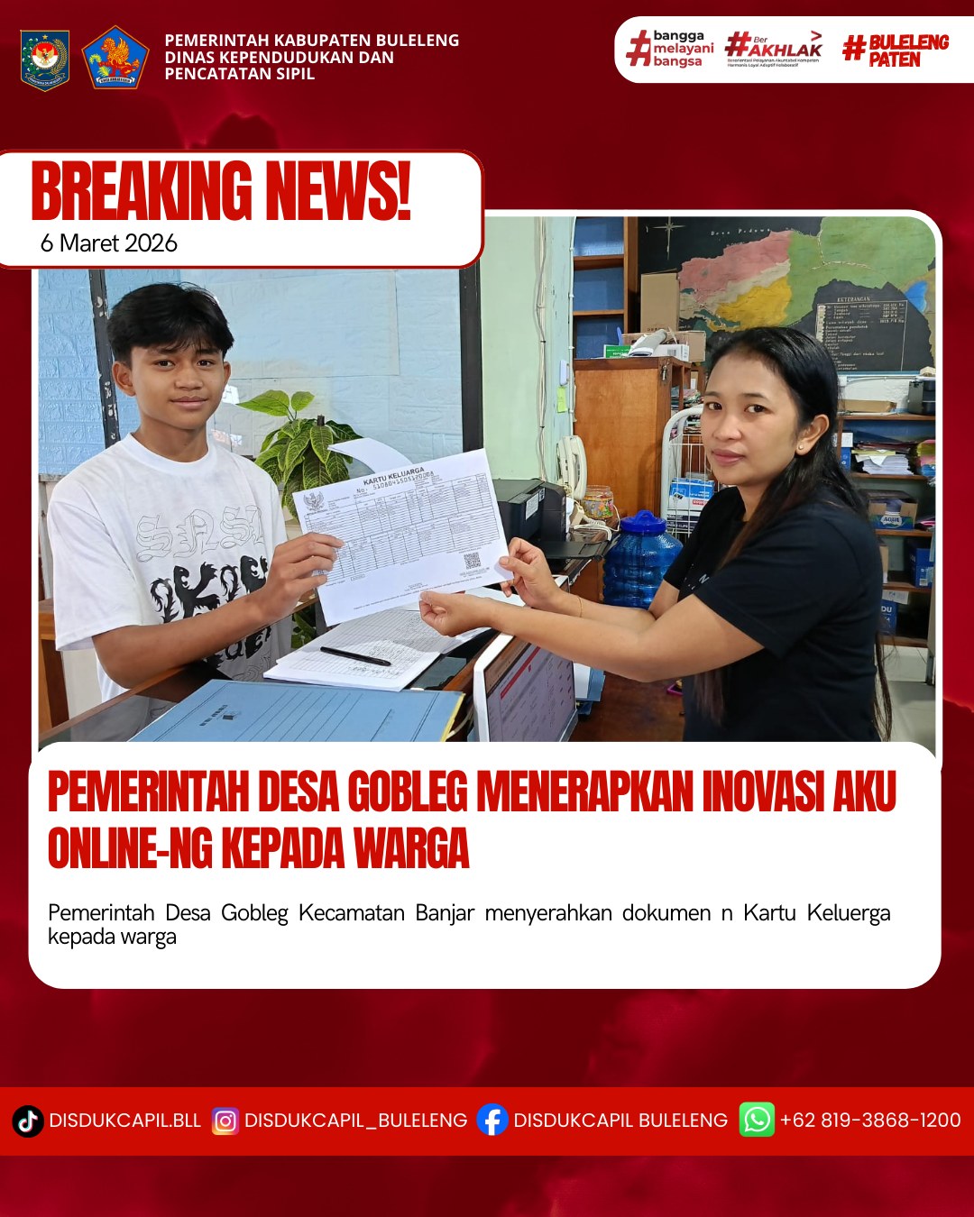 Pemerintah Kabupaten Buleleng melalui Dinas Kependudukan dan Pecatatan Sipil (Disdukcapil) Kabupaten Buleleng memaksimalkan serta mempermudah pelayanan kependudukan masyarakat dengan beberapa inovasi, melalui aplikasi AKU Online-NG. Dimana dalam penerapan aplikasi Aku Online-NG tersebut masyarakat tidak perlu lagi datang ke Dinas Dukcapil untuk melakukan pelayanan langsung cukup dengan datang ke Desa nanti akan dibantu oleh operator Desa masing-masing. Di Desa Gobleg Kecamatan Banjar, telah diserahkan dokumen kependudukan berupa Kartu Keluarga atas nama Putu Ediana yang diserahkan langsung oleh staf administrasi Desa Gobleg bertempat di Kantor Perbekel Desa Gobleg, Kecamatan Banjar, Kabupaten Buleleng, Jumat (6/3).