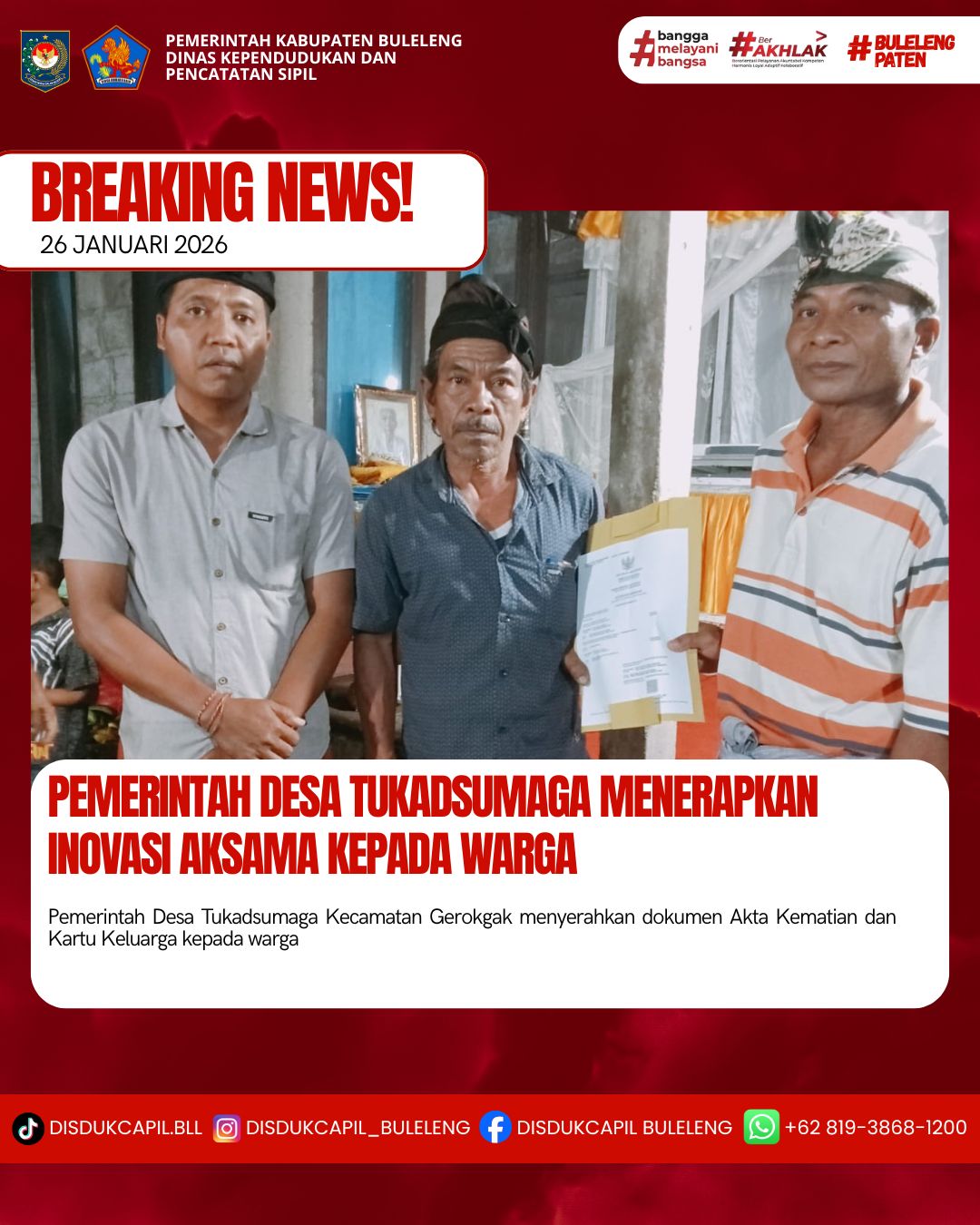 Pemerintah Kabupaten Buleleng melalui Dinas Kependudukan dan Pecatatan Sipil (Disdukcapil) Kabupaten Buleleng memaksimalkan serta mempermudah pelayanan kependudukan masyarakat dengan beberapa inovasi, yakni BALITA (Bayi Lahir Berakta), NYAKSI (Menyerahkan Akta Kawin Saat Acara Perkawinan) dan AKSAMA ( Akta Kematian Diserahkan Saat Masih Berduka) melalui aplikasi Aku Online. Di Desa Tukadsumaga Kecamatan Gerokgak, telah diterapkan program Aksama (Akta Kematian Diserahkan Saat Masih Berduka) yang dilakukan secara langsung oleh Kelian Banjar Yehmas dengan menyerahkan Akta Kematian atas nama NI NENGAH KONDRA dan Kartu Keluarga kepada pihak keluarga almarhum di Desa Tukadusumaga Kecamatan Gerokgak, Senin (26/1).