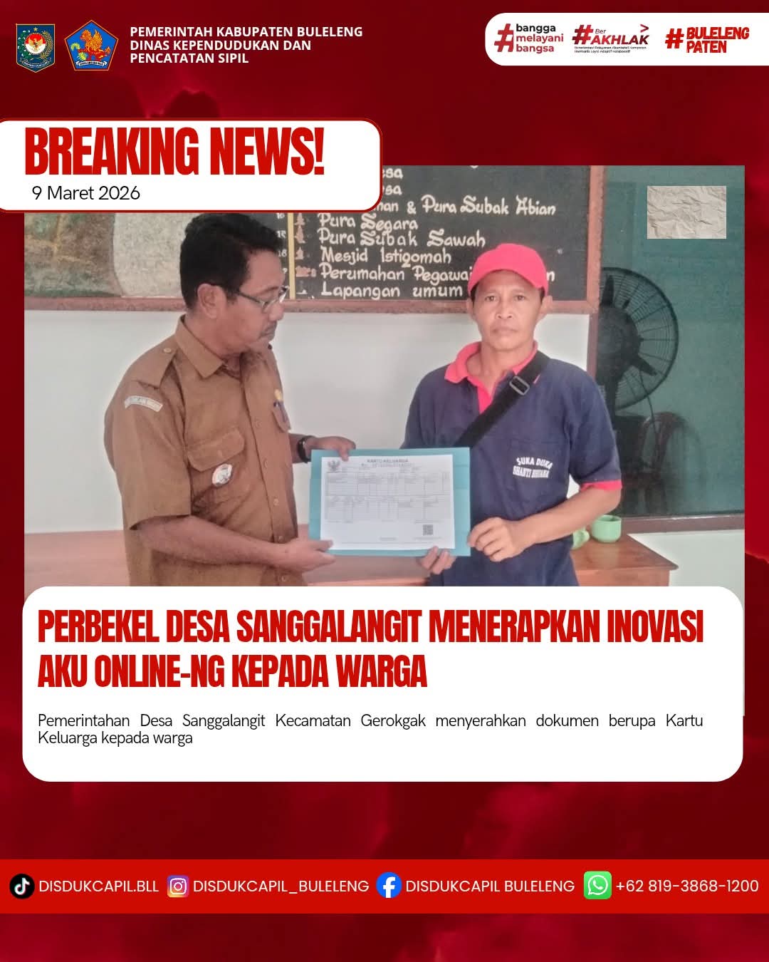 Pemerintah Kabupaten Buleleng melalui Dinas Kependudukan dan Pecatatan Sipil (Disdukcapil) Kabupaten Buleleng memaksimalkan serta mempermudah pelayanan kependudukan masyarakat dengan beberapa inovasi, melalui aplikasi AKU Online-NG. Dimana dalam penerapan aplikasi Aku Online-NG tersebut masyarakat tidak perlu lagi datang ke Dinas Dukcapil untuk melakukan pelayanan langsung cukup dengan datang ke Desa nanti akan dibantu oleh operator Desa masing-masing. Di Desa Sanggalangit Kecamatan Gerokgak, telah diserahkan dokumen kependudukan berupa Kartu Keluarga kepada warga atas nama Putu Arik Sastrawan warga Banjar Dinas Tamansari Desa Sanggalangit Kecamatan Gerokgak oleh Perbekel Desa Sanggalangit I Nyoman Sudika, Senin (9/3).