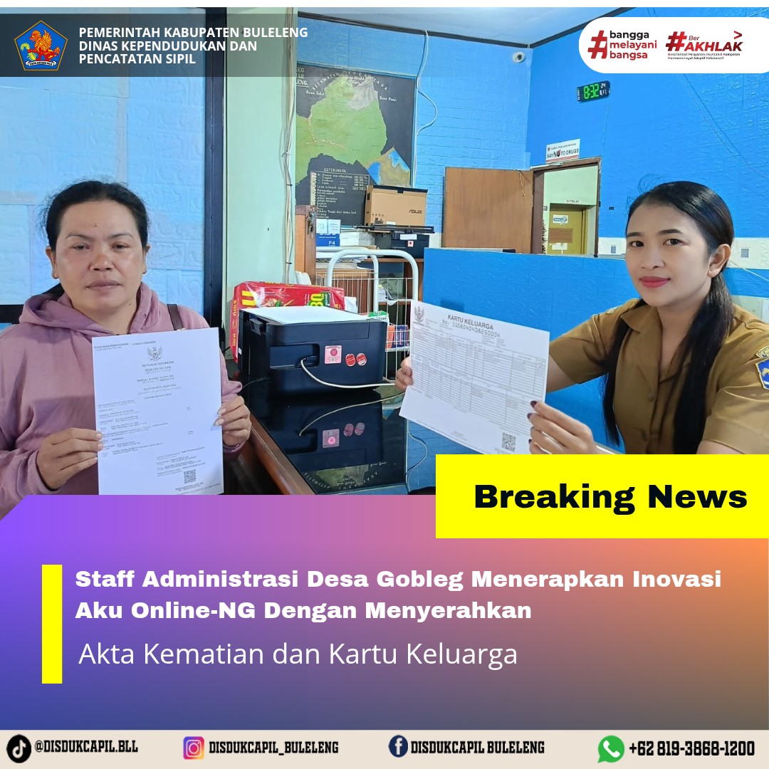 Pemerintah Kabupaten Buleleng melalui Dinas Kependudukan dan Pecatatan Sipil (Disdukcapil) Kabupaten Buleleng memaksimalkan serta mempermudah pelayanan kependudukan masyarakat dengan beberapa inovasi, melalui aplikasi AKU Online-NG. Dimana dalam penerapan aplikasi Aku Online-NG tersebut masyarakat tidak perlu lagi datang ke Dinas Dukcapil untuk melakukan pelayanan langsung cukup dengan datang ke Desa nanti akan dibantu oleh operator Desa masing-masing. Di Desa Gobleg Kecamatan Banjar, telah diserahkan dokumen kependudukan berupa Akta Kematian dan Kartu Keluarga atas nama Kadek Werti yang diserahkan langsung oleh staf administrasi Desa Gobleg bertempat di Kantor Perbekel Desa Gobleg, Kecamatan Banjar, Kabupaten Buleleng, Senin (11/8).