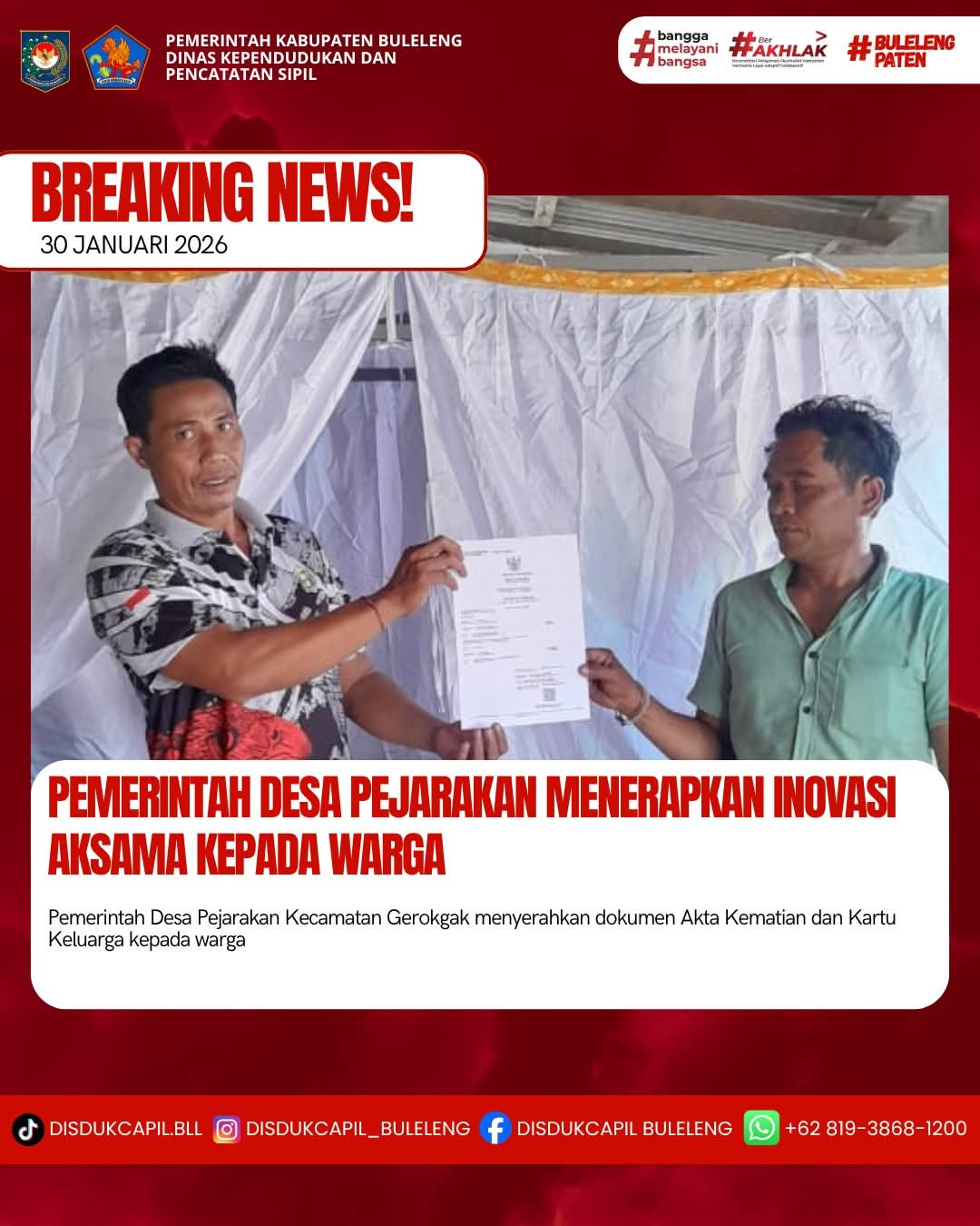 Pemerintah Kabupaten Buleleng melalui Dinas Kependudukan dan Pecatatan Sipil (Disdukcapil) Kabupaten Buleleng memaksimalkan serta mempermudah pelayanan kependudukan masyarakat dengan beberapa inovasi, yakni BALITA (Bayi Lahir Berakta), NYAKSI (Menyerahkan Akta Kawin Saat Acara Perkawinan) dan AKSAMA ( Akta Kematian Diserahkan Saat Masih Berduka) melalui aplikasi Aku Online-NG. Di Desa Pejarakan Kecamatan Gerokgak, telah diterapkan program Aksama (Akta Kematian Diserahkan Saat Masih Berduka) yang dilakukan secara langsung oleh Kelian Banjar Dinas Sandi Kertha Desa Pejarakan dengan menyerahkan Akta Kematian atas nama Kadek Wardana dan Kartu Keluarga atas nama Komang Bayu Sumerta kepada keluarga almarhum di Banjar Dinas Goris Asri, Desa Pejarakan, Kecamatan Gerokgak, Jumat (30/1).