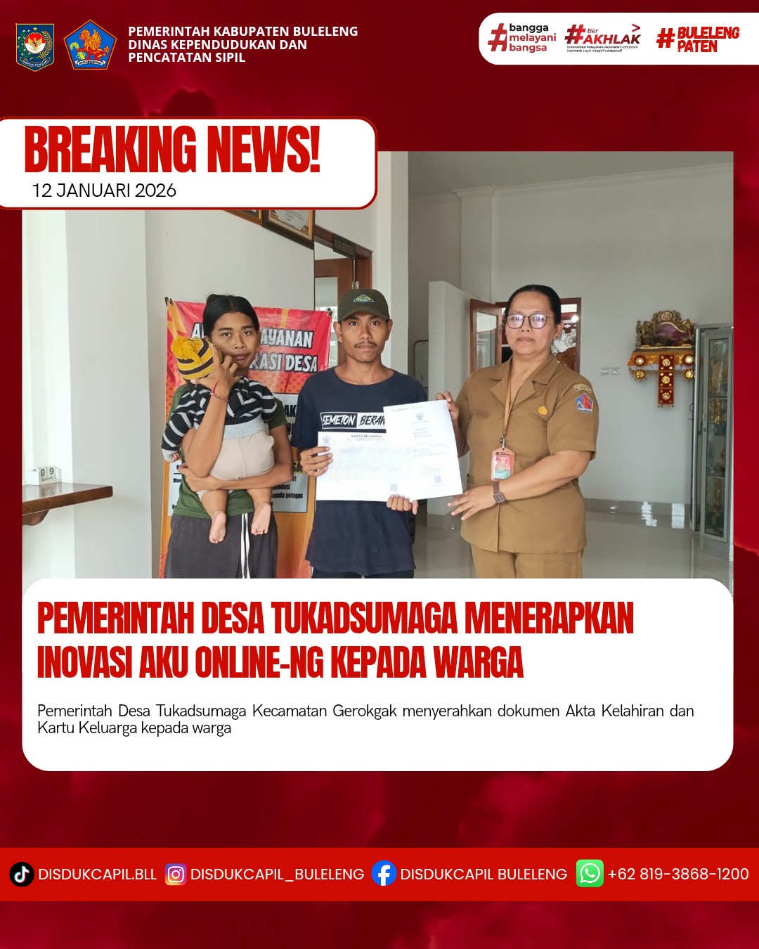 Pemerintah Kabupaten Buleleng melalui Dinas Kependudukan dan Pecatatan Sipil (Disdukcapil) Kabupaten Buleleng memaksimalkan serta mempermudah pelayanan kependudukan masyarakat dengan beberapa inovasi, melalui aplikasi AKU Online-NG. Dimana dalam penerapan aplikasi Aku Online-NG tersebut masyarakat tidak perlu lagi datang ke Dinas Dukcapil untuk melakukan pelayanan langsung cukup dengan datang ke Desa nanti akan dibantu oleh operator Desa masing-masing. Di Desa Tukadsumaga Kecamatan Gerokgak, telah diserahkan dokumen kependudukan berupa Akta Kelahiran atas nama I Putu Andika Pratama dan Kartu Keluarga atas nama I Gede Billy Saputra warga Desa Tukadsumaga Kecamatan Gerokgak yang diserahkan oleh Pemerintah Desa Tukadsumaga di Desa Tukadsumaga, Senin (12/1).