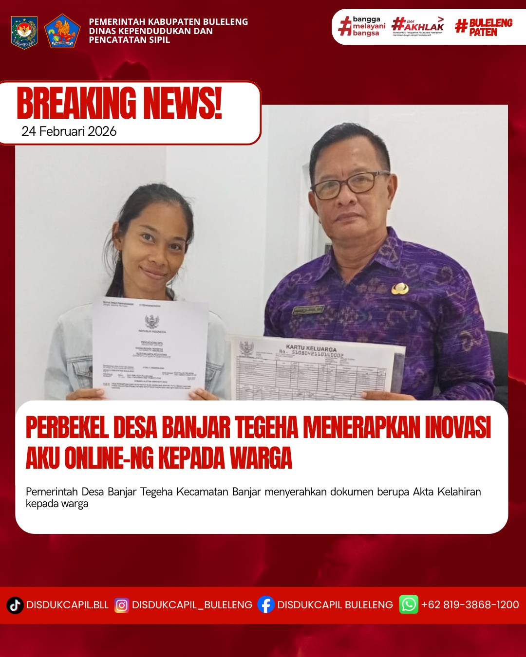Pemerintah Kabupaten Buleleng melalui Dinas Kependudukan dan Pecatatan Sipil (Disdukcapil) Kabupaten Buleleng memaksimalkan serta mempermudah pelayanan kependudukan masyarakat dengan beberapa inovasi, melalui aplikasi AKU Online-NG. Dimana dalam penerapan aplikasi Aku Online-NG tersebut masyarakat tidak perlu lagi datang ke Dinas Dukcapil untuk melakukan pelayanan langsung cukup dengan datang ke Desa nanti akan dibantu oleh operator Desa masing-masing. Di Desa Banjar Tegeha Kecamatan Banjar, telah diserahkan dokumen kependudukan berupa Akta Kelahiran atas nama Ketut Budi Suadnyana dan Kartu Keluarga warga Desa Banjar Dinas Abian Desa Banjar Tegeha yang diserahkan secara langsung oleh Perbekel Desa Banjar Tegeha Ida Bagus Komang Sistiadi, Selasa (24/2).