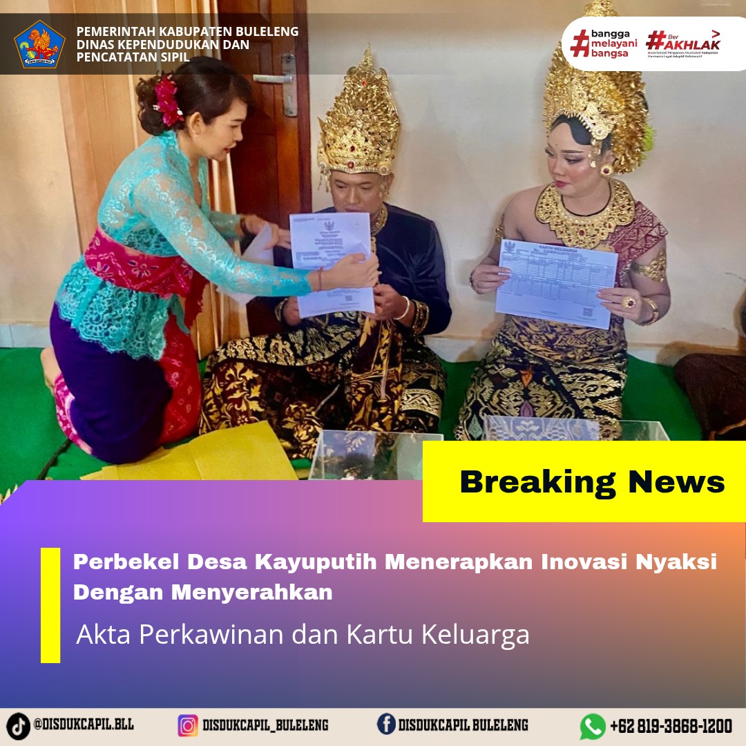 Pemerintah Kabupaten Buleleng melalui Dinas Kependudukan dan Pecatatan Sipil (Disdukcapil) Kabupaten Buleleng memaksimalkan serta mempermudah pelayanan kependudukan masyarakat dengan beberapa inovasi, yakni BALITA (Bayi Lahir Berakta), NYAKSI (Menyerahkan Akta Kawin Saat Acara Perkawinan) dan AKSAMA ( Akta Kematian Diserahkan Saat Masih Berduka) melalui aplikasi Aku Online-NG. Di Desa Kayuputih Kecamatan Banjar, telah diterapkan program NYAKSI (Menyerahkan Akta Kawin Saat Acara Perkawinan) yang dilakukan secara langsung oleh Perbekel Desa Kayuputih Kadek Dina Nuriani dengan menyerahkan Akta Perkawinan dan Kartu Keluarga kepada kedua mempelai dan kartu keluarga masing-masing orang tua mempelai warga Banjar Dinas Menagung Desa Kayuputih Kecamatan Banjar, Jumat (11/7).