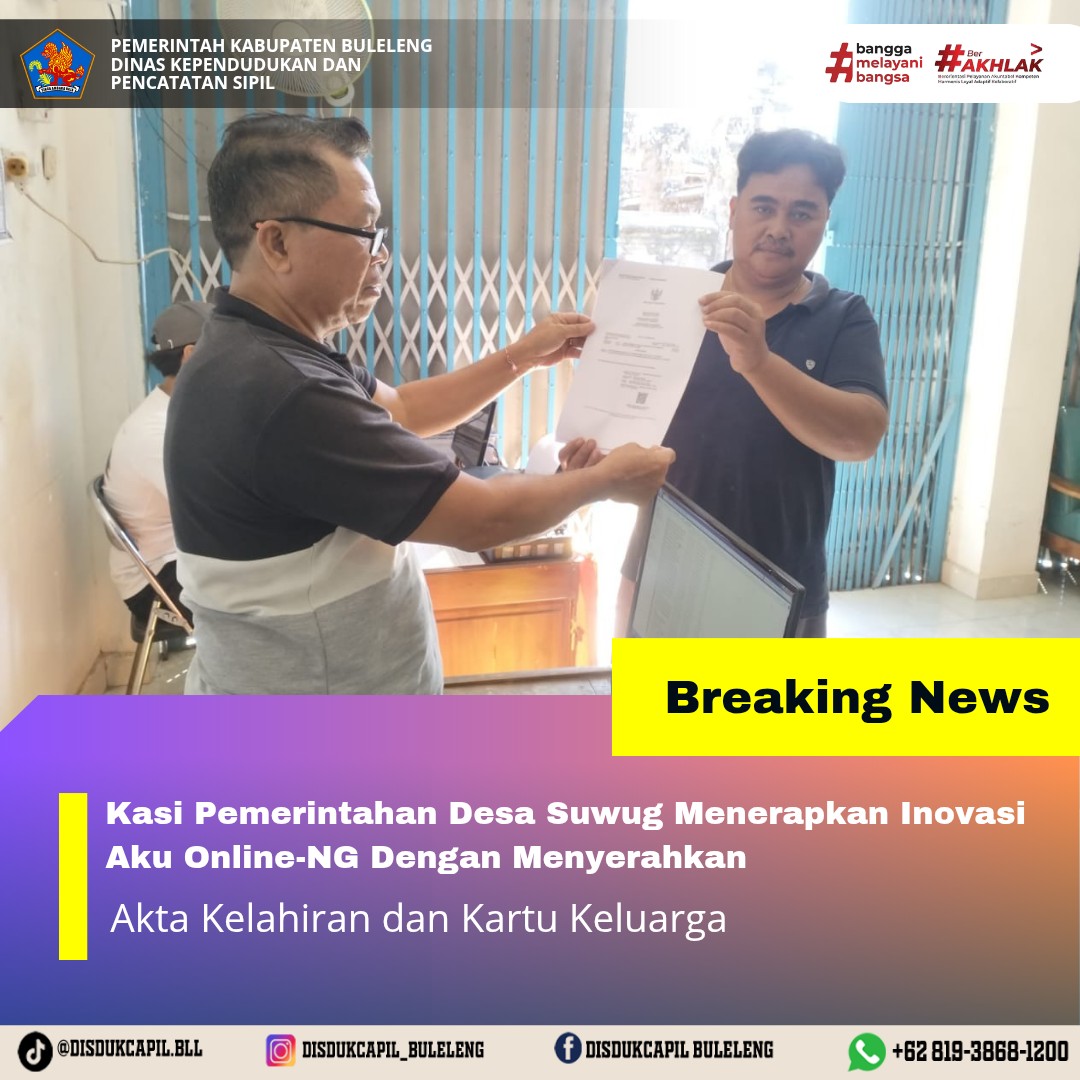 Pemerintah Kabupaten Buleleng melalui Dinas Kependudukan dan Pecatatan Sipil (Disdukcapil) Kabupaten Buleleng memaksimalkan serta mempermudah pelayanan kependudukan masyarakat dengan beberapa inovasi, melalui aplikasi AKU Online-NG. Dimana dalam penerapan aplikasi Aku Online-NG tersebut masyarakat tidak perlu lagi datang ke Dinas Dukcapil untuk melakukan pelayanan langsung cukup dengan datang ke Desa nanti akan dibantu oleh operator Desa masing-masing. Di Desa Suwug Kecamatan Sawan, telah diserahkan dokumen kependudukan berupa Akta Kelahiran dan Kartu Keluarga yang diserahkan secara langsung oleh Pemerintahan Desa Suwug, Jumat (3/10).