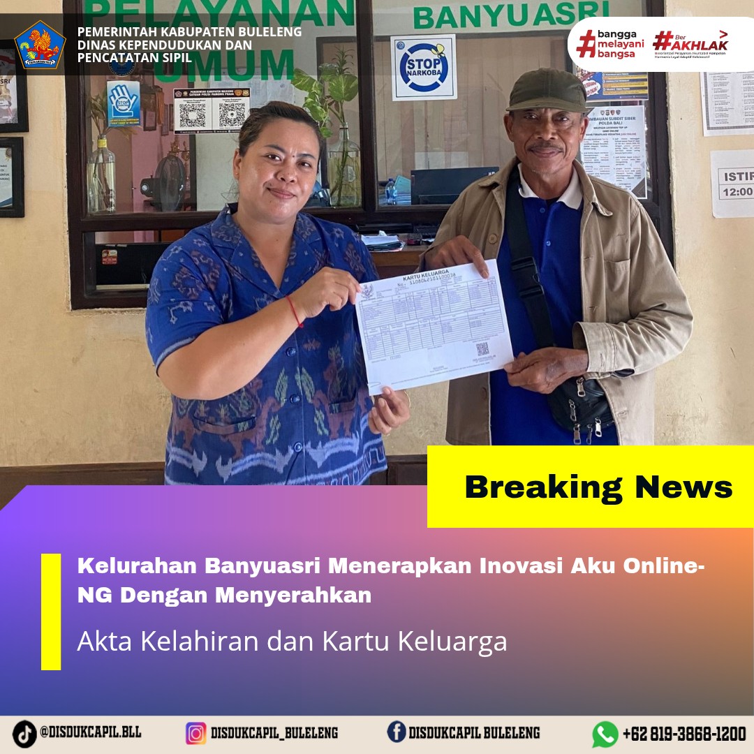 Pemerintah Kabupaten Buleleng melalui Dinas Kependudukan dan Pecatatan Sipil (Disdukcapil) Kabupaten Buleleng memaksimalkan serta mempermudah pelayanan kependudukan masyarakat dengan beberapa inovasi, melalui aplikasi AKU Online-NG. Dimana dalam penerapan aplikasi Aku Online-NG tersebut masyarakat tidak perlu lagi datang ke Dinas Dukcapil untuk melakukan pelayanan langsung cukup dengan datang ke Desa nanti akan dibantu oleh operator Desa masing-masing. Di Kelurahan Banyuasri Kecamatan Buleleng, telah diserahkan dokumen kependudukan berupa Akta Kelahiran dan Kartu Keluarga atas nama Ketut Warsa yang beralamat Jalan Jalak Putih 3 Kelurahan Banyuasri yang diserahkan langsung oleh Kasi Pemerintahan Kelurahan Banyuasri Kecamatan Buleleng, Kabupaten Buleleng, Selasa (2/12).
