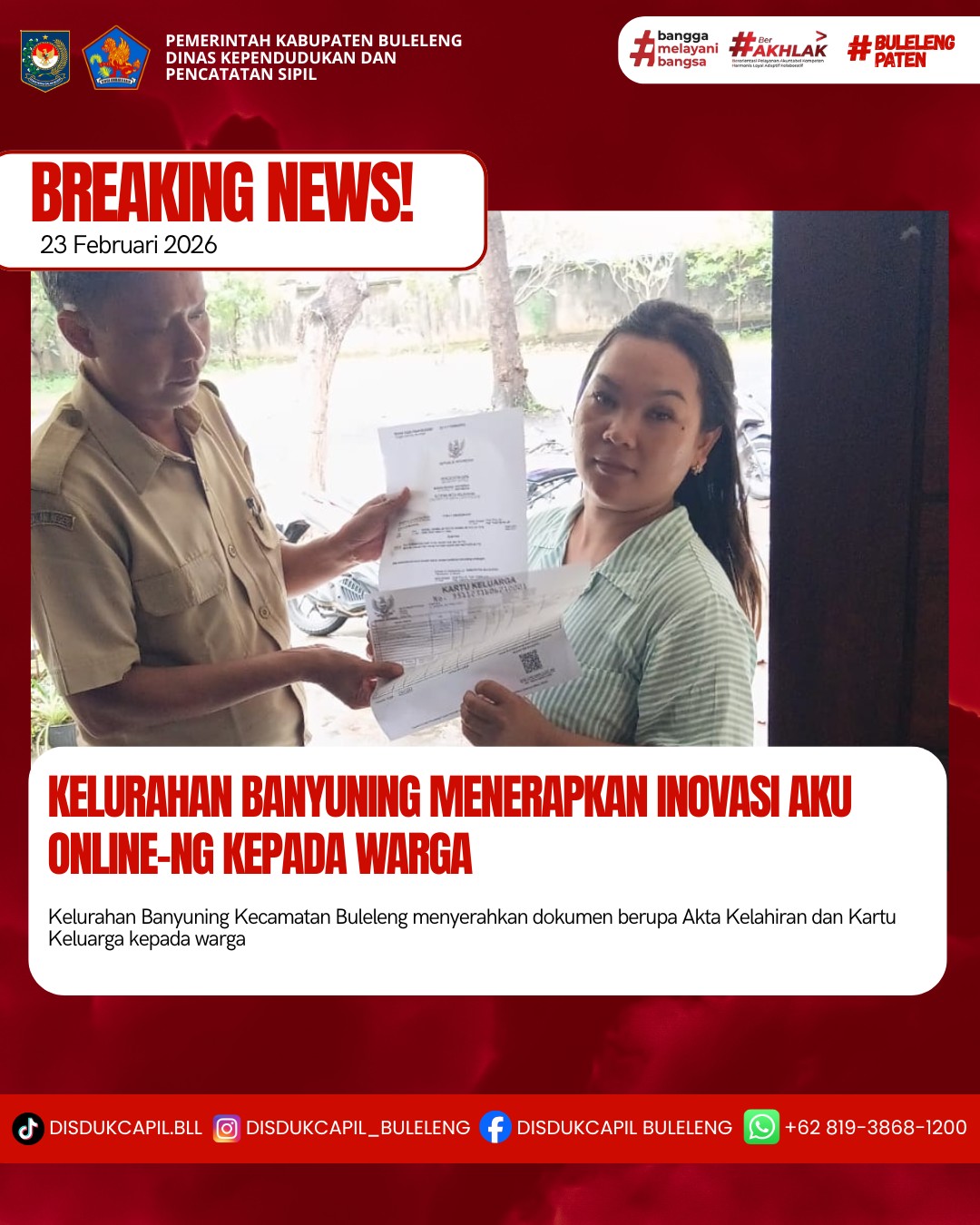 Pemerintah Kabupaten Buleleng melalui Dinas Kependudukan dan Pecatatan Sipil (Disdukcapil) Kabupaten Buleleng memaksimalkan serta mempermudah pelayanan kependudukan masyarakat dengan beberapa inovasi, melalui aplikasi AKU Online-NG. Dimana dalam penerapan aplikasi Aku Online-NG tersebut masyarakat tidak perlu lagi datang ke Dinas Dukcapil untuk melakukan pelayanan langsung cukup dengan datang ke Desa nanti akan dibantu oleh operator Desa masing-masing. Di Kelurahan Banyuning Kecamatan Buleleng, telah diserahkan dokumen kependudukan berupa Akta Kelahiran dan Kartu Keluarga atas nama Rumyani warga Kelurahan Banyuning yang diserahkan langsung oleh Kelurahan Banyuning Kecamatan Buleleng, Kabupaten Buleleng, Senin (23/2).