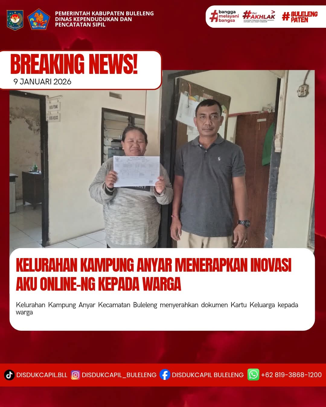 Pemerintah Kabupaten Buleleng melalui Dinas Kependudukan dan Pecatatan Sipil (Disdukcapil) Kabupaten Buleleng memaksimalkan serta mempermudah pelayanan kependudukan masyarakat dengan beberapa inovasi, melalui aplikasi AKU Online-NG. Dimana dalam penerapan aplikasi Aku Online-NG tersebut masyarakat tidak perlu lagi datang ke Dinas Dukcapil untuk melakukan pelayanan langsung cukup dengan datang ke Desa nanti akan dibantu oleh operator Desa masing-masing. Di Kelurahan Kampung Anyar Kecamatan Buleleng, telah diserahkan dokumen kependudukan berupa Kartu Keluarga atas nama Made Suriati yang diserahkan langsung oleh Kelurahan Kampung Anyar Kecamatan Buleleng, Kabupaten Buleleng, Jumat (9/1).
