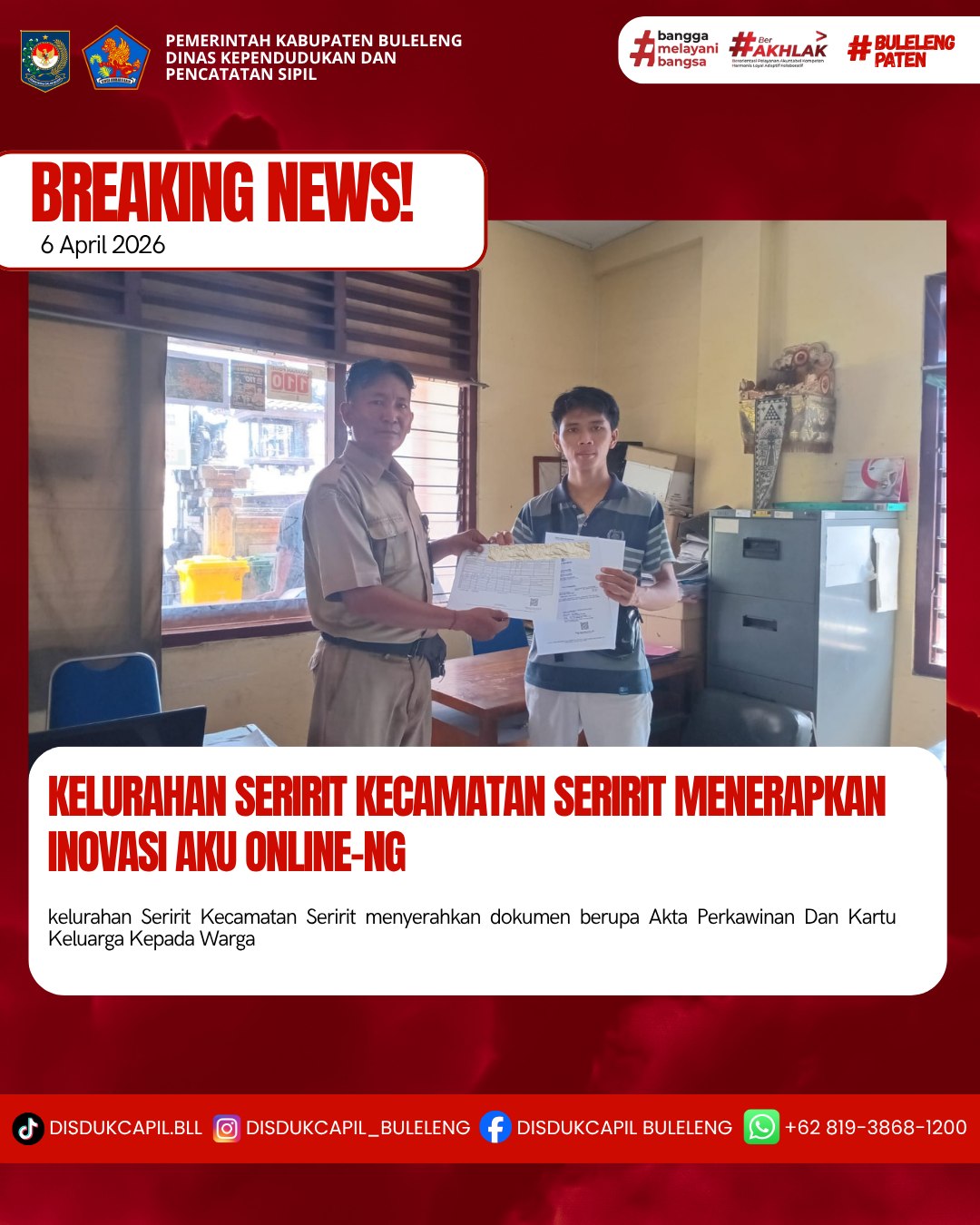 Pemerintah Kabupaten Buleleng melalui Dinas Kependudukan dan Pecatatan Sipil (Disdukcapil) Kabupaten Buleleng memaksimalkan serta mempermudah pelayanan kependudukan masyarakat dengan beberapa inovasi, melalui aplikasi AKU Online-NG. Dimana dalam penerapan aplikasi Aku Online-NG tersebut masyarakat tidak perlu lagi datang ke Dinas Dukcapil untuk melakukan pelayanan langsung cukup dengan datang ke Desa nanti akan dibantu oleh operator Desa masing-masing. Di Kelurahan Seririt Kecamatan Seririt, telah diserahkan dokumen kependudukan berupa akta kelahiran atas nama Mira Eliana Grace putri dan nara liora grace putri KK i bagus febrianto di Kecamatan Seririt, Kabupaten Buleleng, Senin (6/4).