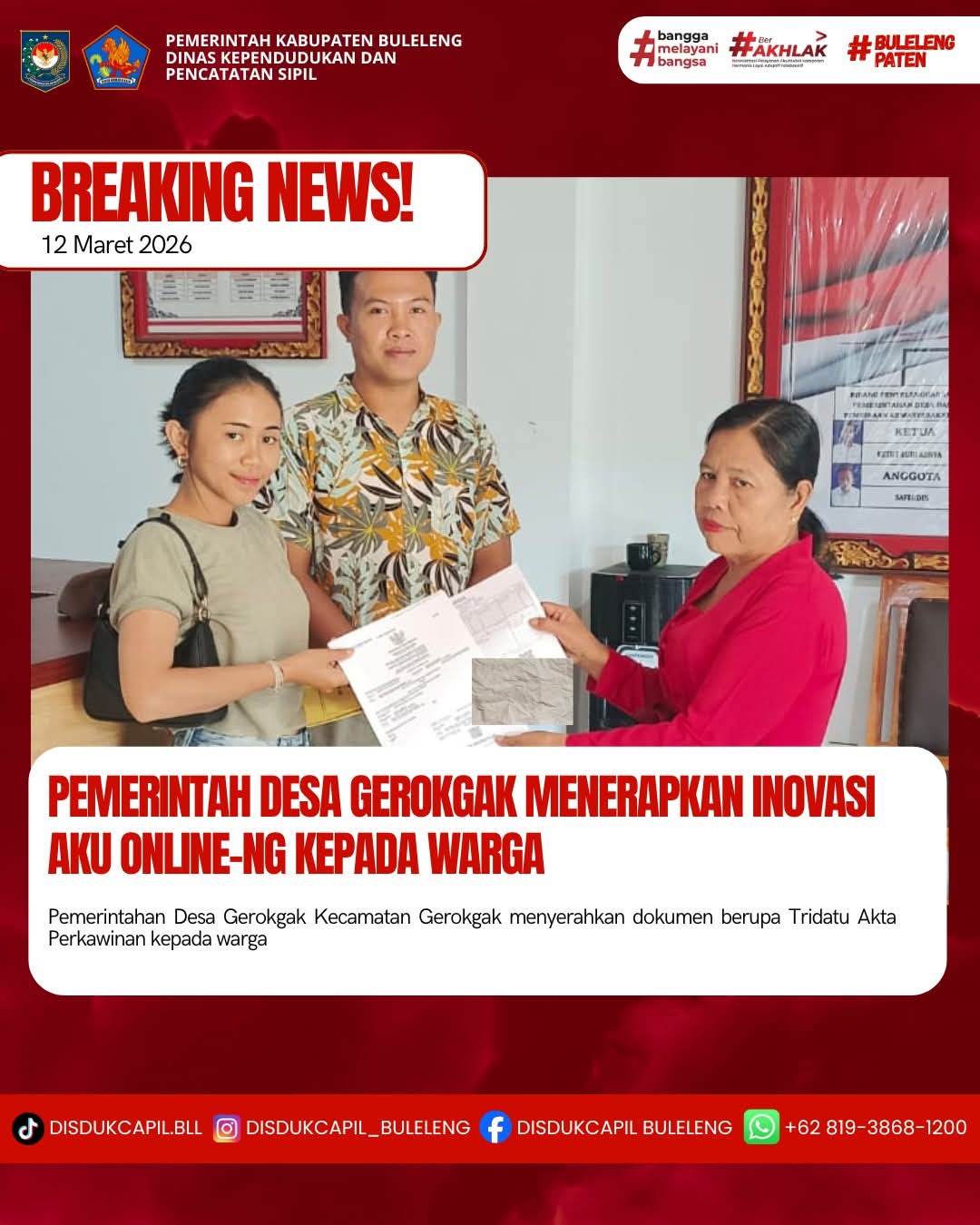 Pemerintah Kabupaten Buleleng melalui Dinas Kependudukan dan Pecatatan Sipil (Disdukcapil) Kabupaten Buleleng memaksimalkan serta mempermudah pelayanan kependudukan masyarakat dengan beberapa inovasi, melalui aplikasi AKU Online-NG. Dimana dalam penerapan aplikasi Aku Online-NG tersebut masyarakat tidak perlu lagi datang ke Dinas Dukcapil untuk melakukan pelayanan langsung cukup dengan datang ke Desa nanti akan dibantu oleh operator Desa masing-masing. Di Desa Gerokgak Kecamatan Gerokgak, telah diserahkan dokumen kependudukan berupa Akta Perkawinan atas nama Ida Bagus Surya Bagaskara Ambarayuda dan Ida Ayu Dewi Pradnya Swari warga Banjar Dinas Pucaksari yang diserahkan langsung oleh Kasi Pemerintahan Desa Gerokgak di Desa Gerokgak, Kecamatan Gerokgak, Kabupaten Buleleng, Kamis (12/3).