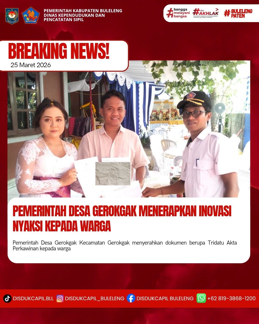 Pemerintah Kabupaten Buleleng melalui Dinas Kependudukan dan Pecatatan Sipil (Disdukcapil) Kabupaten Buleleng memaksimalkan serta mempermudah pelayanan kependudukan masyarakat dengan beberapa inovasi, yakni BALITA (Bayi Lahir Berakta), NYAKSI (Menyerahkan Akta Kawin Saat Acara Perkawinan) dan AKSAMA ( Akta Kematian Diserahkan Saat Masih Berduka) melalui aplikasi Aku Online-NG. Di Desa Gerokgak Kecamatan Gerokgak, telah diterapkan program NYAKSI (Menyerahkan Akta Perkawinan Saat Acara Perkawinan) yang dilakukan secara langsung oleh Kelian Banjar Dinas Pucaksari dengan menyerahkan Akta Perkawinan atas nama Ida Bagus Alit Ratu Pada dengan I Dewa Ayu Made Paramita Dewi dan Kartu Keluarga kepada kedua mempelai dan kartu keluarga masing-masing orang tua mempelai di Desa Gerokgak Kecamatan Gerokgak, Rabu (25/3).