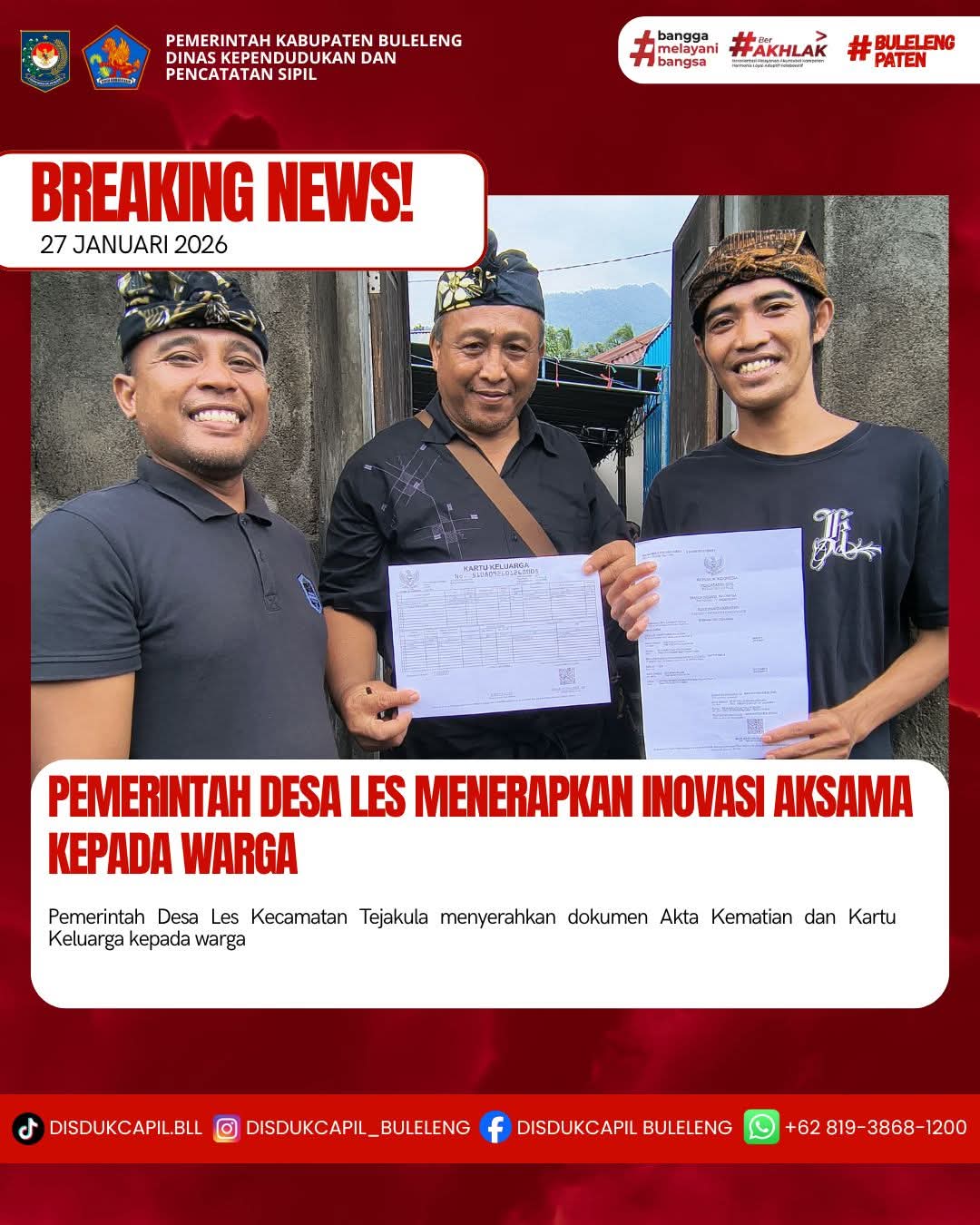 Pemerintah Kabupaten Buleleng melalui Dinas Kependudukan dan Pecatatan Sipil (Disdukcapil) Kabupaten Buleleng memaksimalkan serta mempermudah pelayanan kependudukan masyarakat dengan beberapa inovasi, yakni BALITA (Bayi Lahir Berakta), NYAKSI (Menyerahkan Akta Kawin Saat Acara Perkawinan) dan AKSAMA ( Akta Kematian Diserahkan Saat Masih Berduka) melalui aplikasi Aku Online-NG. Di Desa Les Kecamatan Tejakula, telah diterapkan program Aksama (Akta Kematian Diserahkan Saat Masih Berduka) yang dilakukan secara langsung oleh Kelian Banjar Dinas Kawanan Desa Les dengan menyerahkan Akta Kematian dan Kartu Keluarga kepada keluarga almarhum di Banjar Dinas Kawanan, Desa Les, Selasa (27/1).