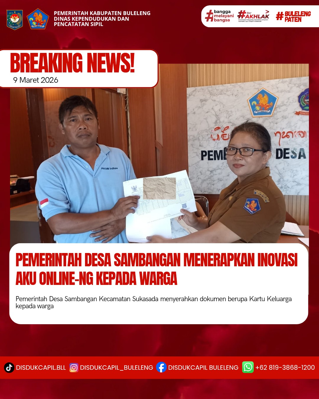 Pemerintah Kabupaten Buleleng melalui Dinas Kependudukan dan Pecatatan Sipil (Disdukcapil) Kabupaten Buleleng memaksimalkan serta mempermudah pelayanan kependudukan masyarakat dengan beberapa inovasi, melalui aplikasi AKU Online-NG. Dimana dalam penerapan aplikasi Aku Online-NG tersebut masyarakat tidak perlu lagi datang ke Dinas Dukcapil untuk melakukan pelayanan langsung cukup dengan datang ke Desa nanti akan dibantu oleh operator Desa masing-masing. Di Desa Sambangan Kecamatan Sukasada, telah diserahkan dokumen kependudukan berupa dua buah dokumen Kartu Keluarga atas nama Putu Mertayasa warga BD. Babakan warga Banjar Dinas Sambangan diserahkan oleh Kasi Pemerintahan Desa Sambangan bertempat di Kantor Perbekel Desa Sambangan, Kecamatan Sukasada, Kabupaten Buleleng, Senin (9/3).