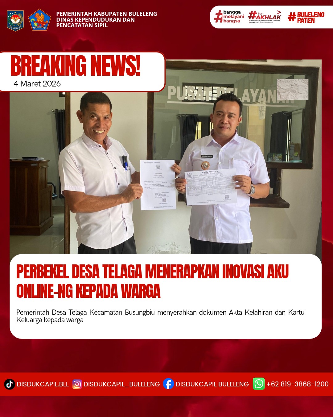 Pemerintah Kabupaten Buleleng melalui Dinas Kependudukan dan Pecatatan Sipil (Disdukcapil) Kabupaten Buleleng memaksimalkan serta mempermudah pelayanan kependudukan masyarakat dengan beberapa inovasi, melalui aplikasi AKU Online-NG. Dimana dalam penerapan aplikasi Aku Online-NG tersebut masyarakat tidak perlu lagi datang ke Dinas Dukcapil untuk melakukan pelayanan langsung cukup dengan datang ke Desa nanti akan dibantu oleh operator Desa masing-masing. Di Desa Telaga Kecamatan Busungbiu, telah diserahkan dokumen kependudukan berupa Kartu Keluarga atas nama I PUTU DIKY CIPTA WIRYAWAN serta Akta Kelahiran Anak atas nama NI PUTU ERWINA AYU PRADNYANDANI yang diwakili oleh Ayah I PUTU DIKY CIPTA WIRYAWAN yang diserahkan langsung oleh Perbekel Desa Telaga MADE HENDRA MAHAYUDA,S.PD bertempat di Kantor Perbekel Desa Telaga, Kecamatan Busungbi, Kabupaten Buleleng, Rabu (4/3).
