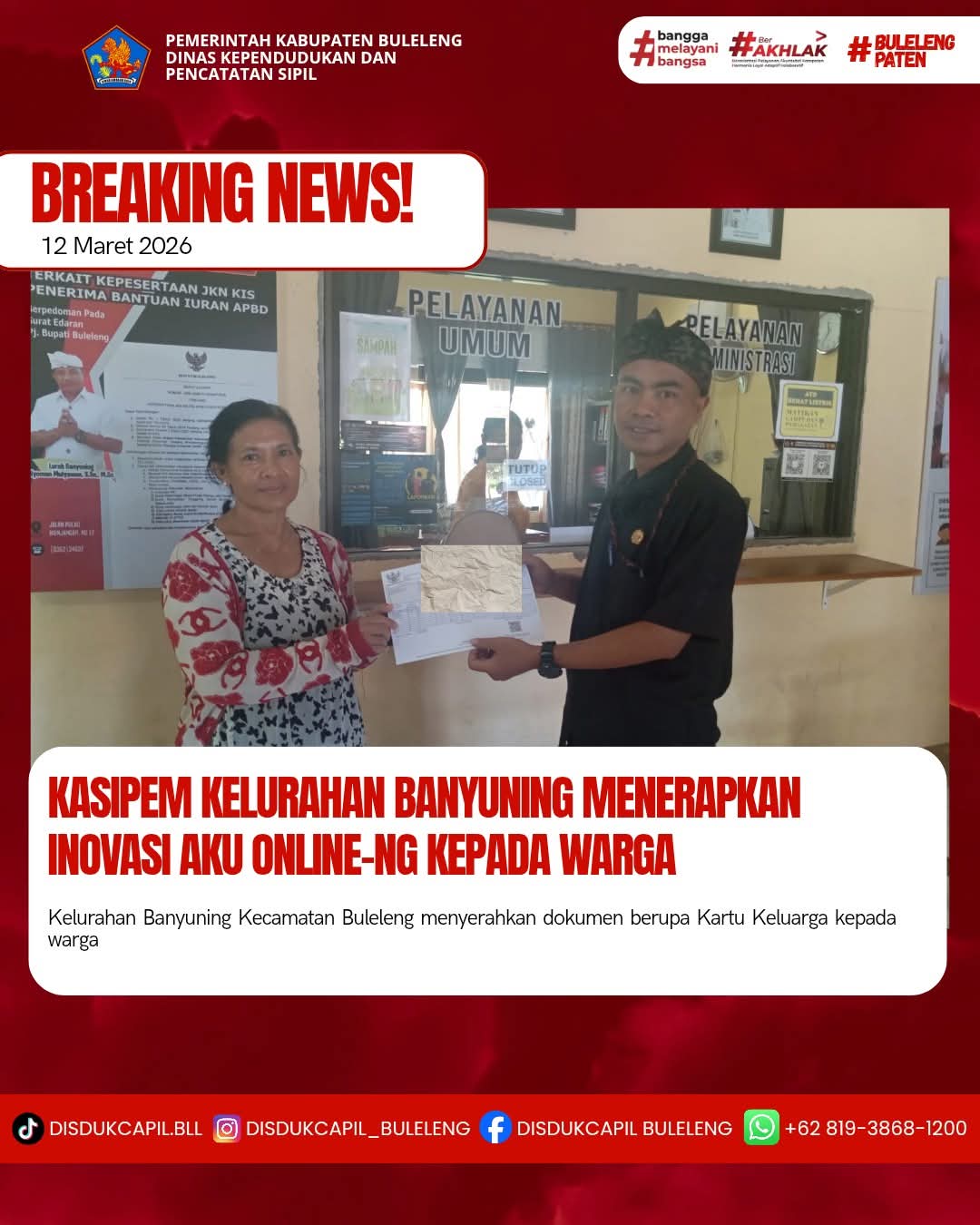 Pemerintah Kabupaten Buleleng melalui Dinas Kependudukan dan Pecatatan Sipil (Disdukcapil) Kabupaten Buleleng memaksimalkan serta mempermudah pelayanan kependudukan masyarakat dengan beberapa inovasi, melalui aplikasi AKU Online-NG. Dimana dalam penerapan aplikasi Aku Online-NG tersebut masyarakat tidak perlu lagi datang ke Dinas Dukcapil untuk melakukan pelayanan langsung cukup dengan datang ke Desa nanti akan dibantu oleh operator Desa masing-masing. Di Kelurahan Banyuasri Kecamatan Buleleng, telah diserahkan dokumen kependudukan berupa Kartu Keluarga yang diserahkan langsung oleh Kasi Pemerintahan Kelurahan Banyuasri, Kecamatan Buleleng, Kabupaten Buleleng, Kamis (12/3).