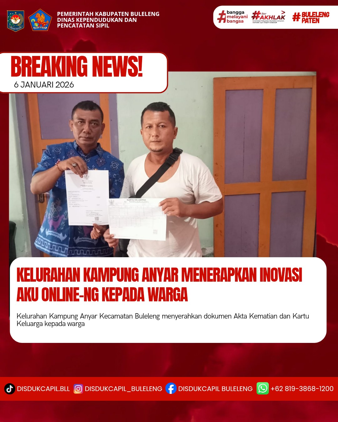 Pemerintah Kabupaten Buleleng melalui Dinas Kependudukan dan Pecatatan Sipil (Disdukcapil) Kabupaten Buleleng memaksimalkan serta mempermudah pelayanan kependudukan masyarakat dengan beberapa inovasi, melalui aplikasi AKU Online-NG. Dimana dalam penerapan aplikasi Aku Online-NG tersebut masyarakat tidak perlu lagi datang ke Dinas Dukcapil untuk melakukan pelayanan langsung cukup dengan datang ke Desa nanti akan dibantu oleh operator Desa masing-masing. Di Kelurahan Kampung Anyar Kecamatan Buleleng, telah diserahkan dokumen kependudukan berupa Akta Kematian dan Kartu Keluarga atas nama Cahyadi yang diserahkan langsung oleh Kelurahan Kampung Anyar Kecamatan Buleleng, Kabupaten Buleleng, Selasa (6/1).
